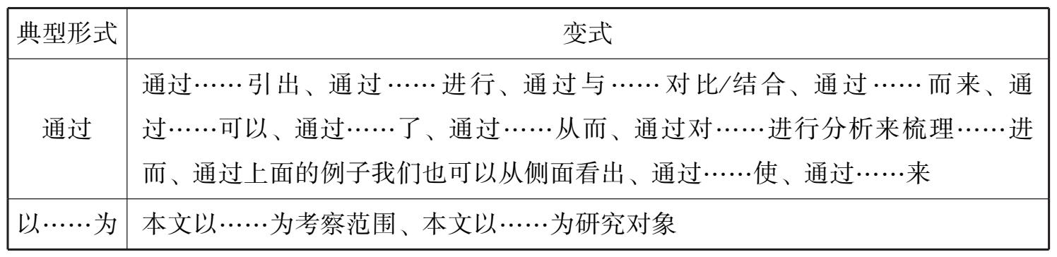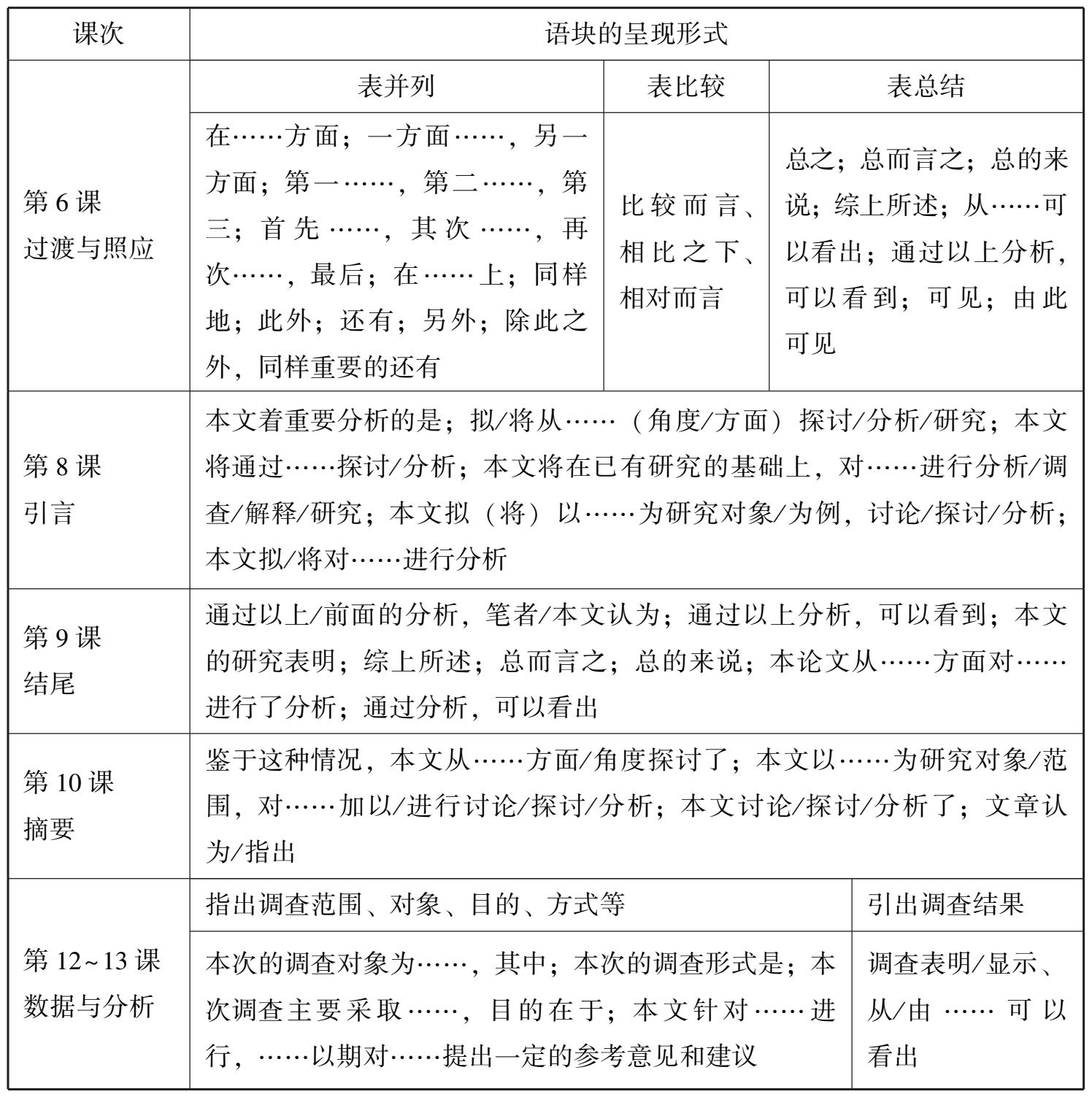 《留学生毕业论文写作教程》全书共16课,每课包括学习目标、阅读与讨论、写作知识、范例/范文和练习。其中有6课给出了语块(见表2-13)。在呈现方式上,采用的是先列举常用的语块,再举出典型例句的形式,如结尾部分,给出语块“通过以上/前面的分析,笔者/本文认为……”,举例为“通过以上分析,笔者认为,中越饮料广告修辞手法主要有以下异同”。在范文部分有提问练习,如找出某段表示总结的句式或表达形式有哪些。在练习部分,有请根据摘要/引言/结语部分的写作方法重新排序并适当增删词语这样的练习。