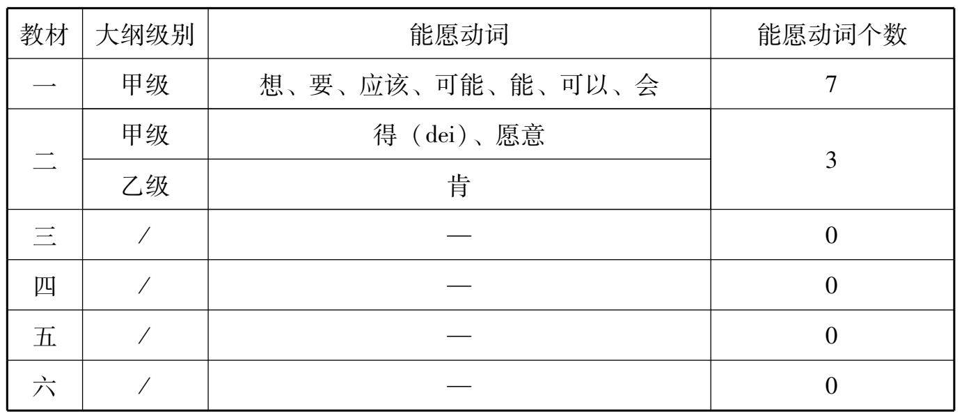 总的来说,前人关于习得偏误的研究大部分集中在对偏误的类型及原因的分析,并据此设计教学策略。而且其中很多都是针对个别词,如“会”“能”“可以”。在教材研究方面,通过对不同对外汉语教材中能愿动词的布局情况进行系统对比研究的还是相对较少。不可否认的是,对外汉语教学中教材的编排研究和教学研究都是极为重要的部分。
