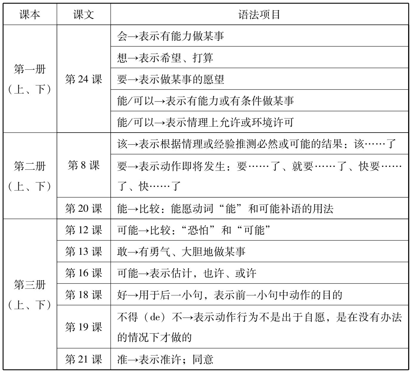 《汉语教程》中选编的能愿动词的出现及语法项目如表5所示。