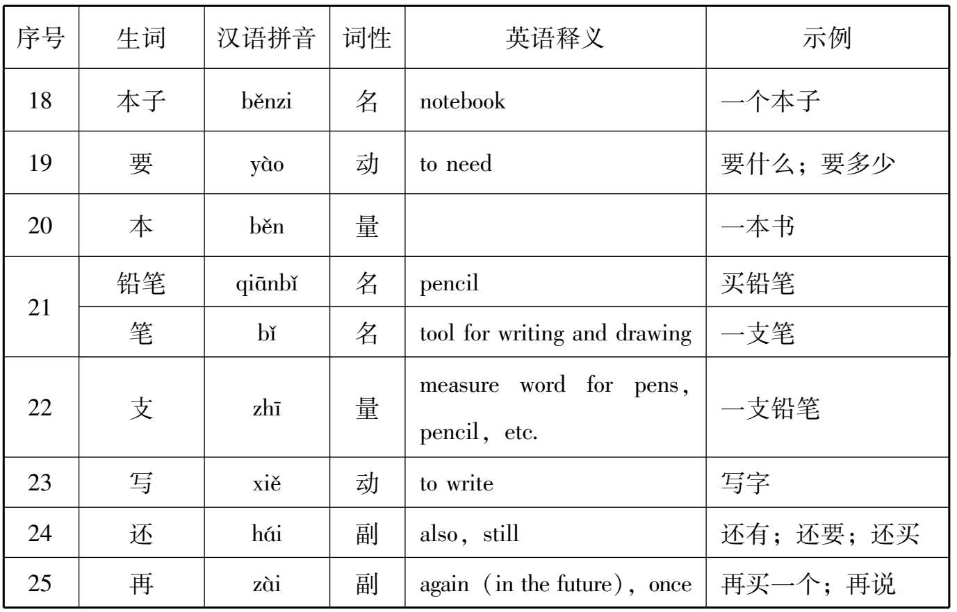 《汉语教程》中生词的体例是序号、生词、拼音、词性(中文缩写)、英文注释。
