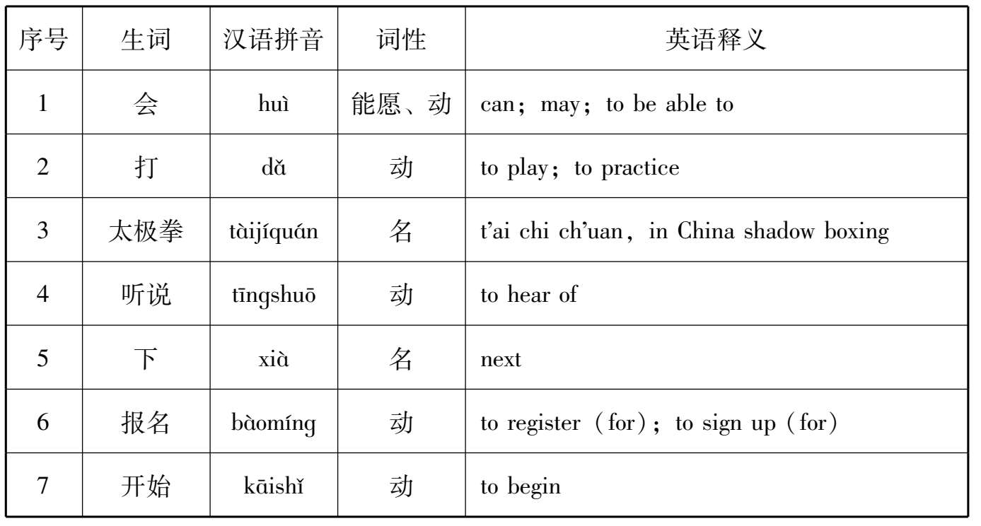 词义的注释一般会涉及义项的选择、媒介语的使用、释义方式等问题。《会通汉语》中生词的体例是序号、生词、拼音、词性(中文缩写)、英文注释、例子。从能愿动词的英文翻译、义项注释、例子设置等方面进行考察,《会通汉语》采用了媒介语英语进行释义,对义项的讲解则采取中英文相结合的方式。《会通汉语》在选择英文释义词语时,绝大部分只选择一个最简明的英文单词。《会通汉语》中生词表紧密地附在每个功能项目下的简短对话和课文后面,即生词和课文出现在同一页,这样的编排便于学生查找生词。