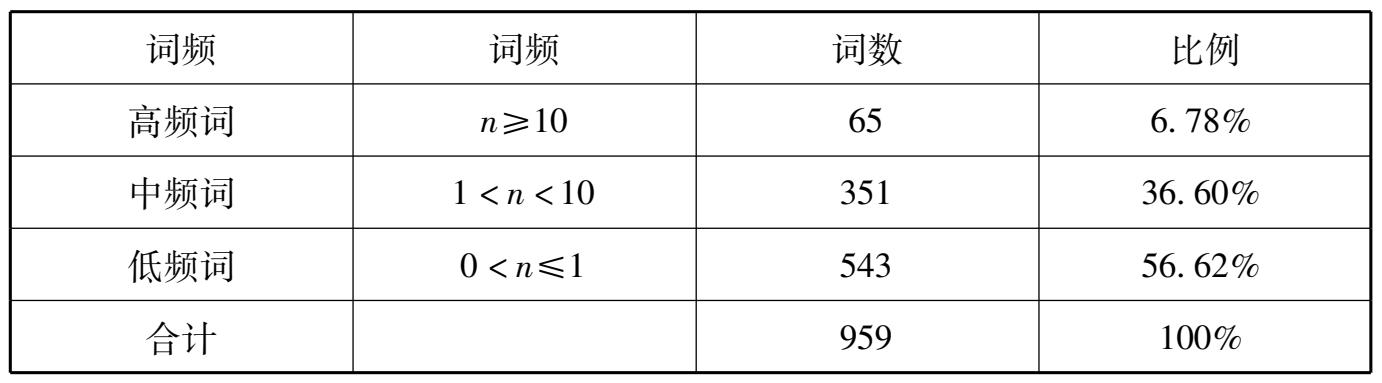 由表3可得,词频越高,词数越少。低频词(一现词)的比例占一半以上,但一现词数量多还不能充分说明问题,我们需要进一步统计959个释义用词的等级。