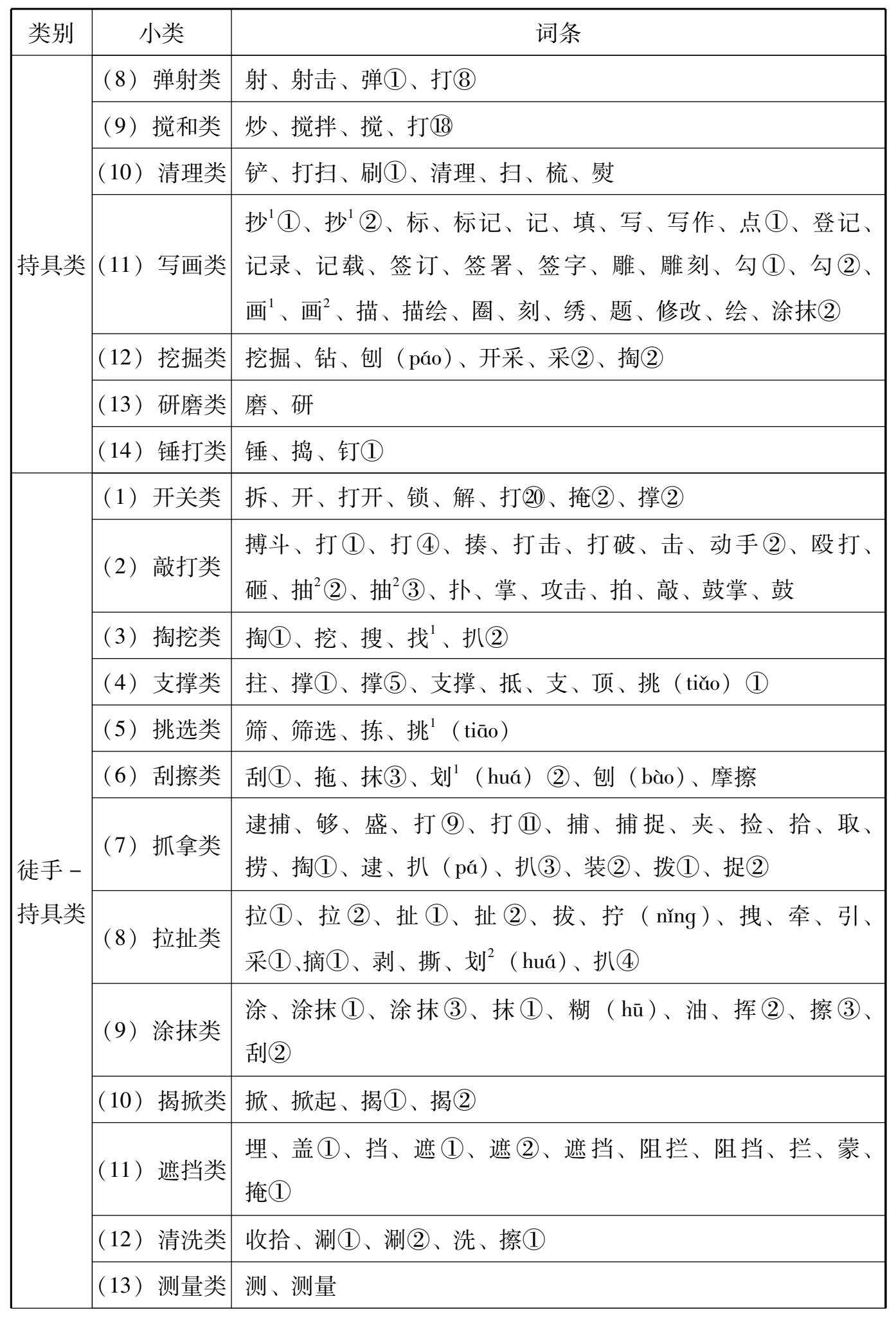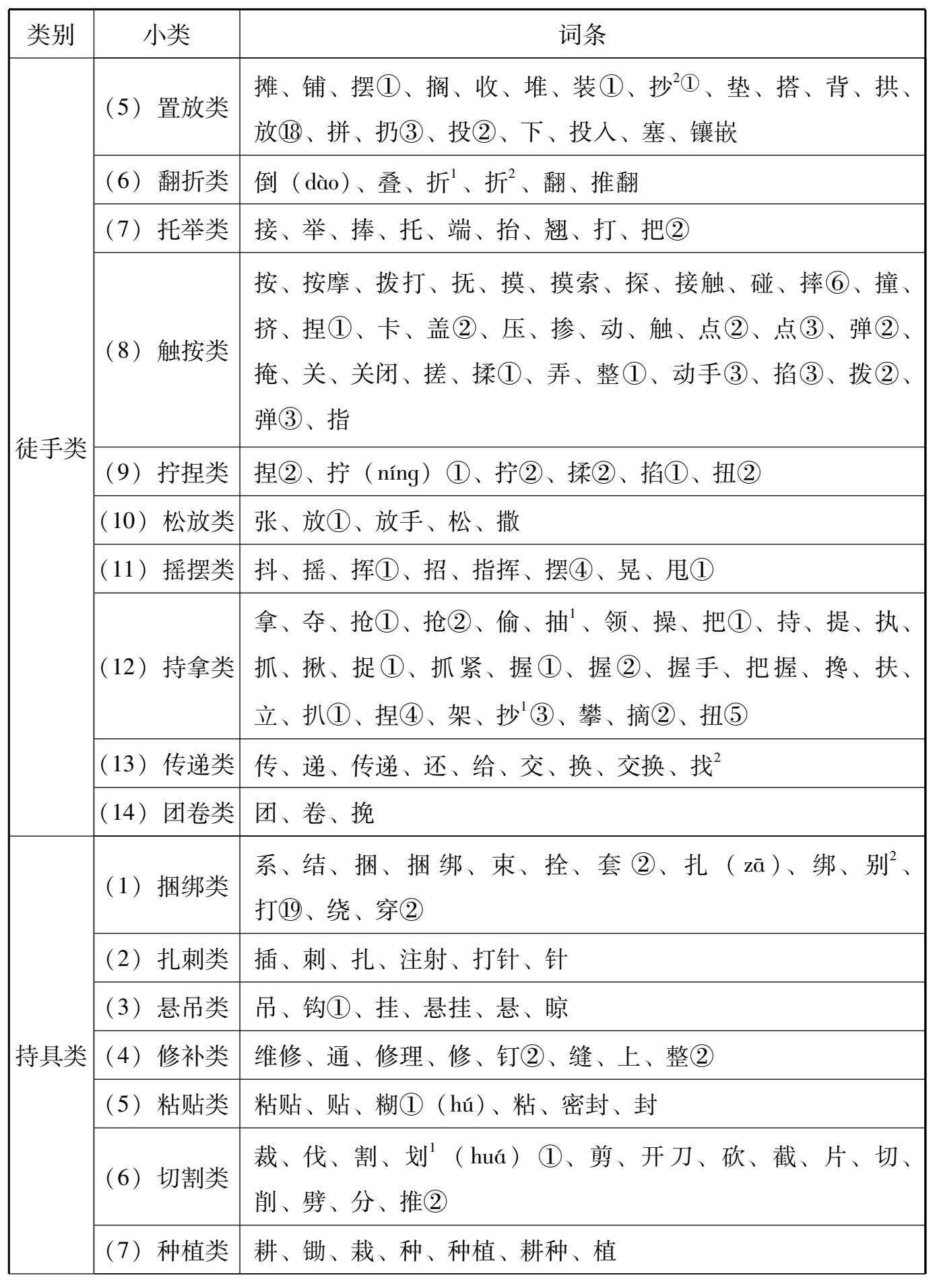 将手部动词分为徒手类、持具类、徒手-持具类。马春媛
