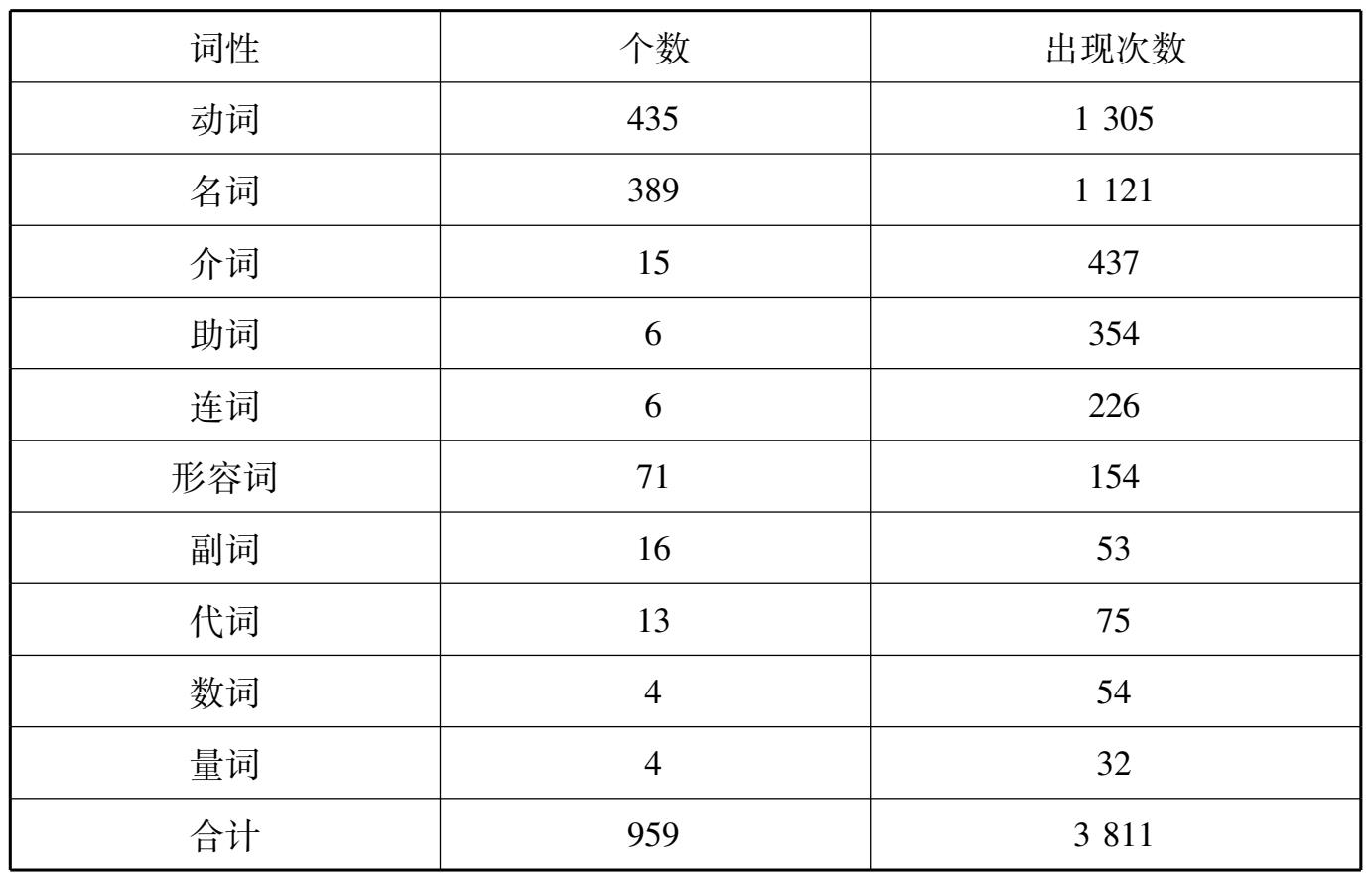 抽取高频词,我们发现在65个高频词中,数量位于前三的分别是动词、名词和介词。为避免以偏概全,我们将959个词按照词性进行分类,统计的结果如表5所示。