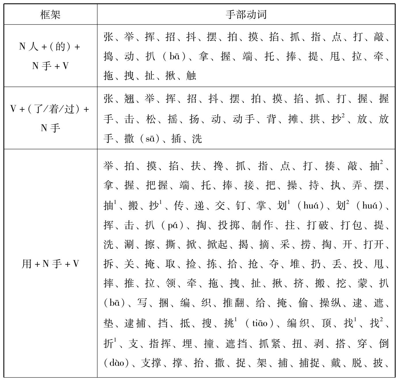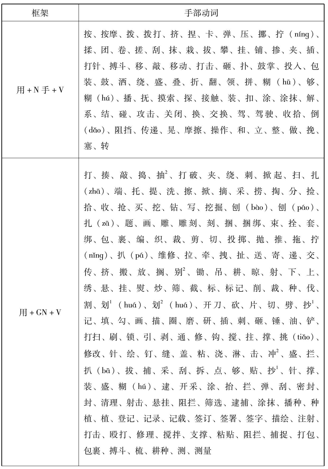 其中,“N人”表示人的名词或代词;“N手”是指手部器官的名词,根据“手”的定义,“N手”不包括手臂、手腕和与手有关的其他身体部位,所以“手臂”“手腕”“胳膊”等词语不进入该语法框架,能进入语法框架的主要有“手”“手指”“拳头”“指头”“手掌”等;框架4的“GN”表示工具的名词,如绳子、刀、笔等;框架5的“手部器官量词”一般有“拳”“掌”“巴掌”,如“打了一拳”“抽了一巴掌”等;框架6的“C”是补语,如“张开(了)手”“扎破(了)手指”等。