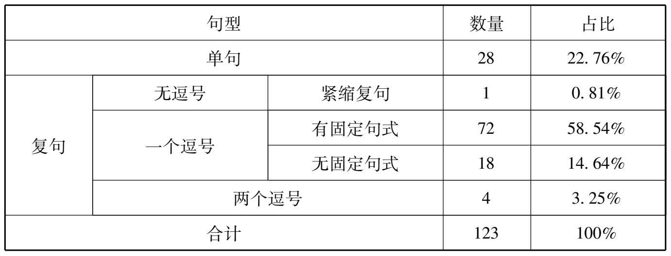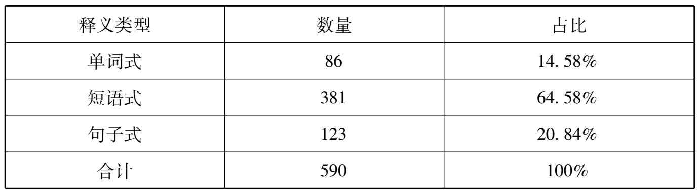 据统计,句子式释义共有123条。由于词典体例的特殊性,不以句号区分短语式和句子式,因此,我们将主谓短语和句子处理为句子式释义。句子式释义有单句和复句之分,二者则以逗号的个数区分,需要注意有的复句是紧缩复句,没有逗号标志。