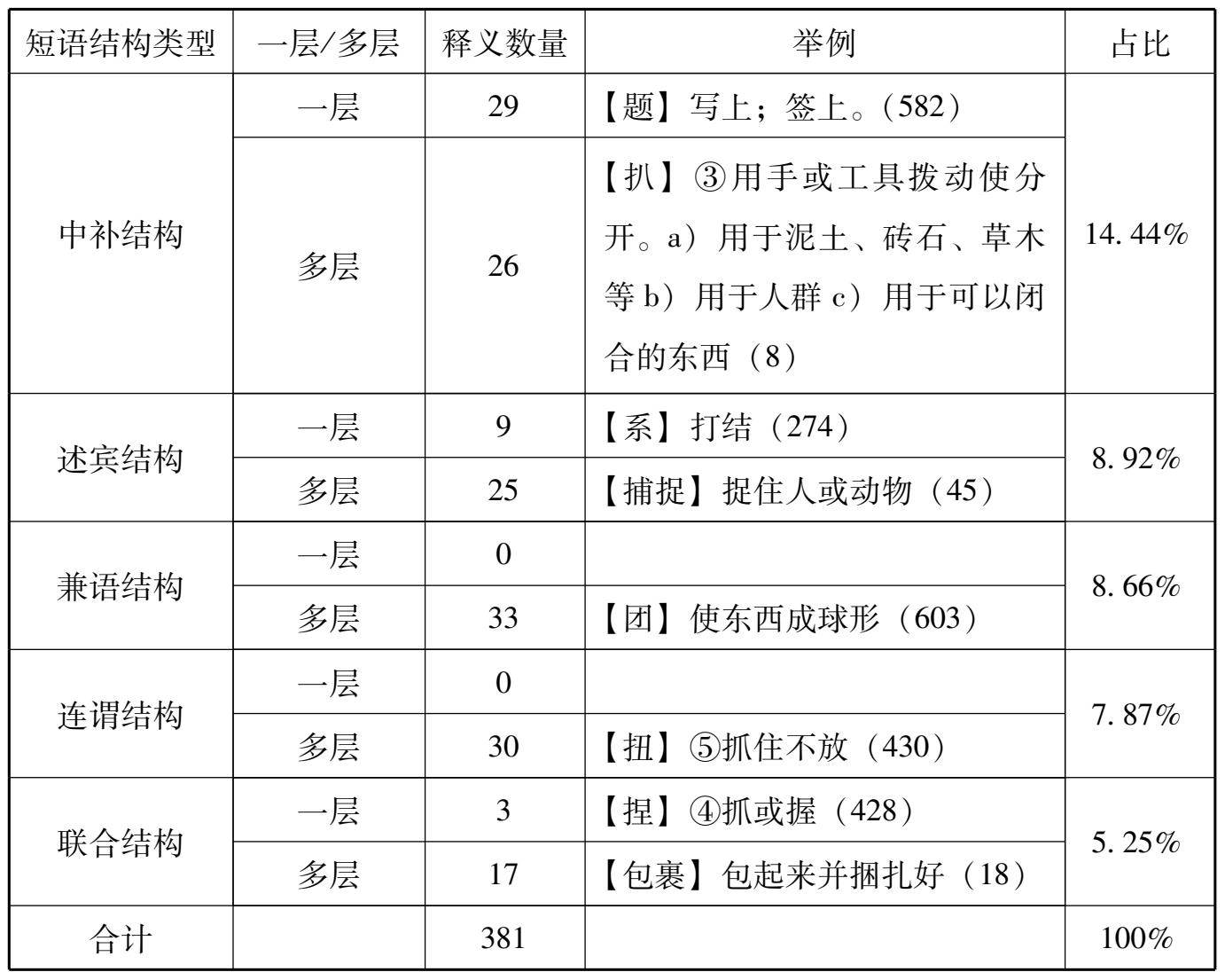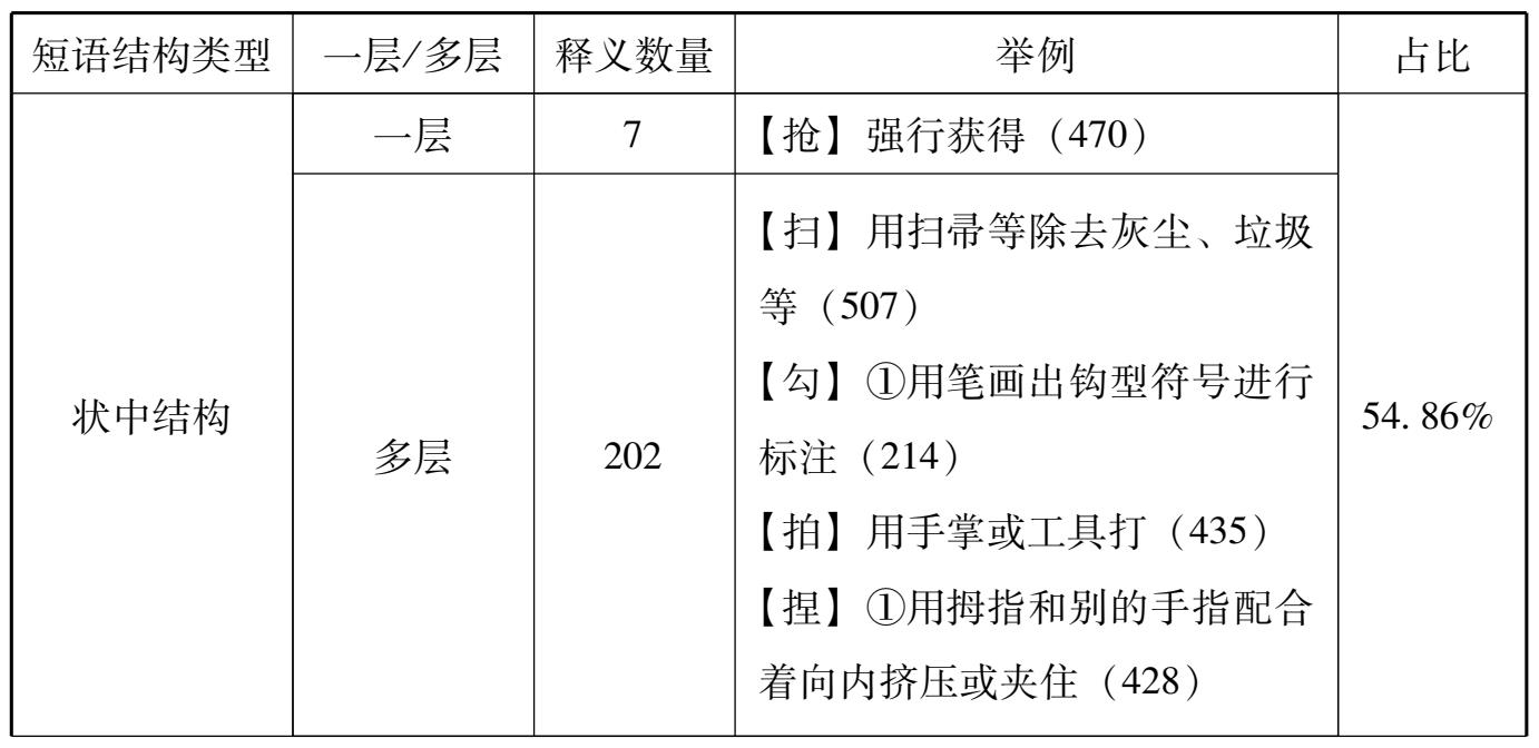 短语式释义以多层短语为主,其中状中短语是最常用的结构类型,且一般位于母义项。因为手部动词释义需要具体说明整个动作过程,修饰动作的成分详细。其余的短语类型使用次数较为平均,但都远少于状中短语。在子义项上,则以中补短语最为常用,其他结构均涉及,但规律没有中补结构明显。