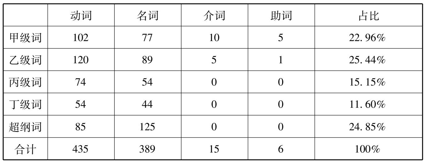 (以下简称《大纲》),我们统计了低、中、高频词的词汇等级,结果如表4所示。