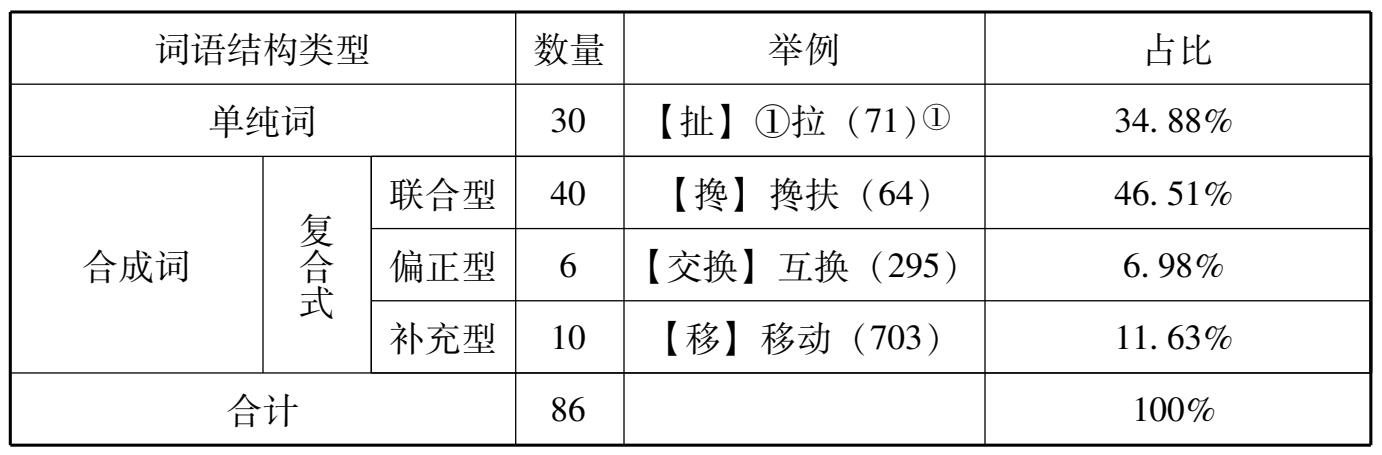 因是手部动词释义,联合型和补充型一般是“动+动”的功能类型。偏正型量少且规律不明显。