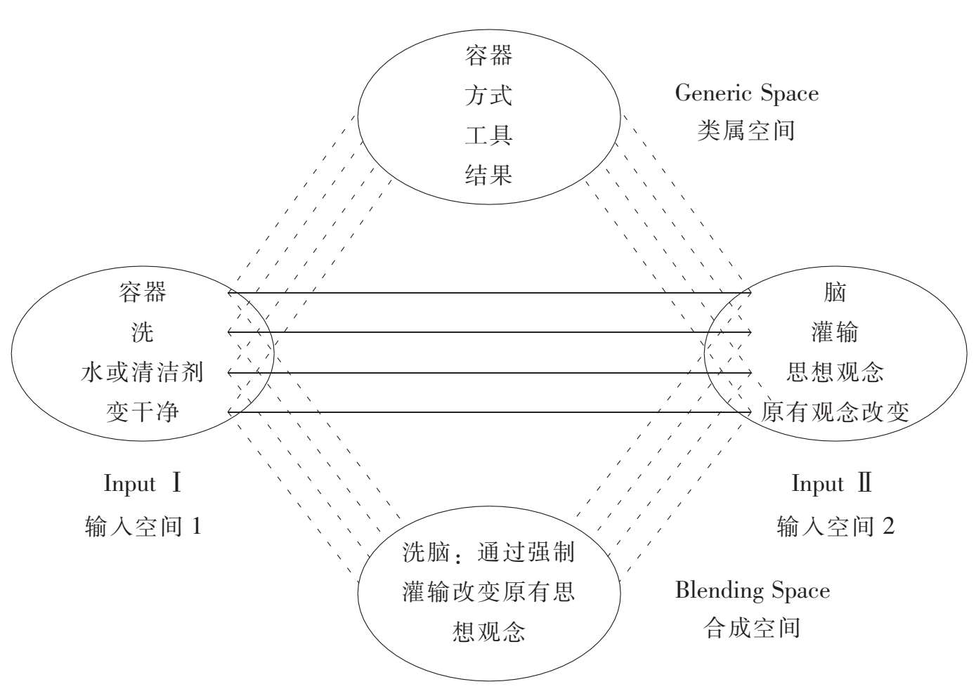 如图 1所示,四个心理空间都含有独具特色的意义结构。输入空间 1即源域中的相关概念组成的结构关系包含“用水或清洁剂洗容器使之变干净”;在目标域“脑”的心理空间中,相关概念组成“用灌输思想观念的方式使原有思想观念发生改变”的意义结构;在更为抽象的类属空间中,涉及的相关概念有“容器”“方式”“工具”“结果”;最后形成的心理空间是以上三个心理空间的结构在其中建立联系并合成概念的场所,即“洗”的对象变成“脑”,从而构成“洗脑”一词,用以表示“通过强制灌输改变原有思想观念”的隐喻意义。