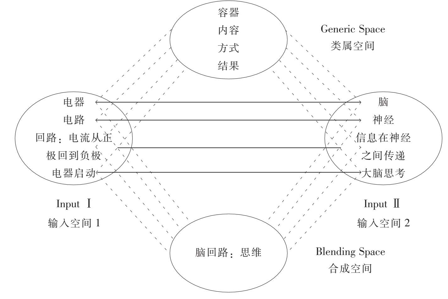如图 2所示,输入空间 1中电器与电路是容器和内容的关系,电器启动的条件是一个回路,即电流要从正极出发最后回到负极;输入空间 2中大脑思考并最终作出反应的过程和电器工作的基本原理相似;类属空间是两个输入空间的上位概念,包含“容器”“内容”“方式”“结果”等概念。三个心理空间的特征在合成空间中得以体现,生成新的组合形式“脑回路”,用以指称“思维”。