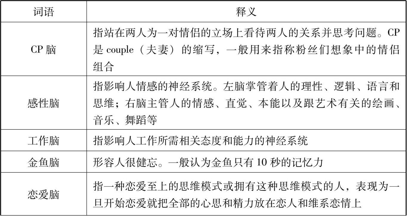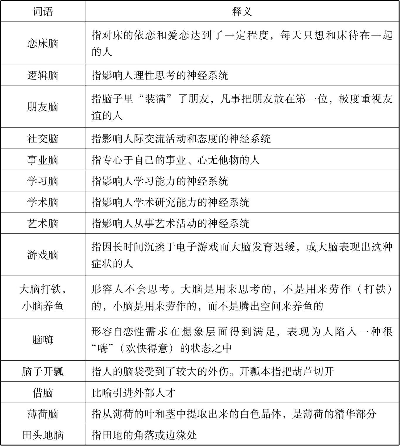 的普遍性。除了脑科学领域内针对“脑”的研究而生成的专业术语以外,在日常交际中更是存在大量含“脑”的言语表达。与专业术语不同,由“脑”作为主要成分构成的流行语极少为词典收录,但它们的通行范围较广,使用频度高,作为活的语料流行于口语交际中,是人们认知思维成果的重要载体,也是社会生活各方面变化的重要反映。