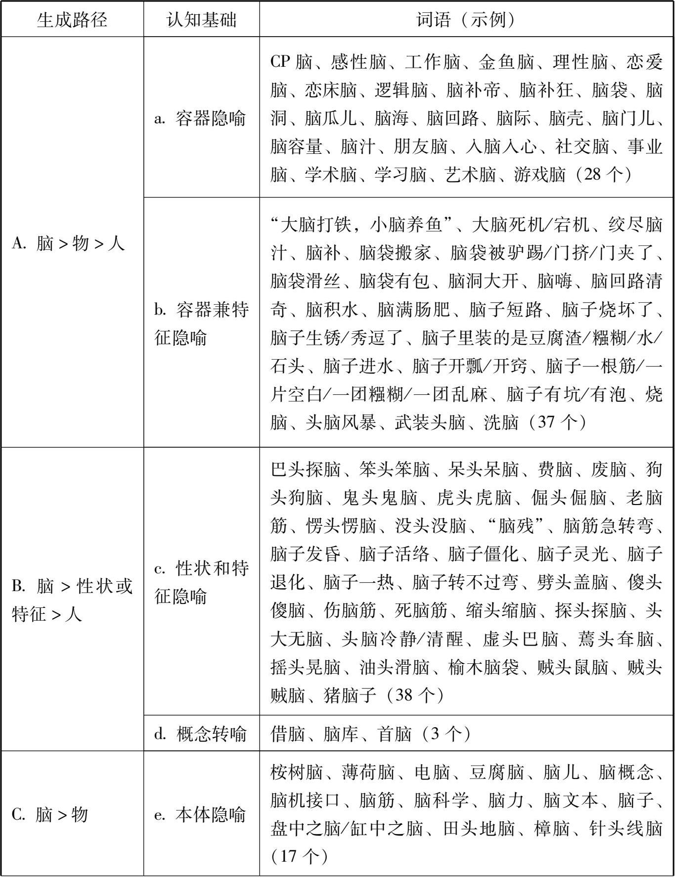 “脑”的容器隐喻所构词语,包括带容器标记的固定表达:“满脑子+(的/是+)NP”和“脑子(里)+ (是+)NP”等;不带标记的词,如“脑洞”“脑补”“脑回路”“烧脑”“游戏脑”“恋爱脑”,以及短语“脑子生锈”“脑子短路”“脑子开窍”“脑回路短路”“脑回路清奇”等,都是基于“脑”与“容器”语义域之间的互动而创造出来的,共同构成了一个隐喻网络。