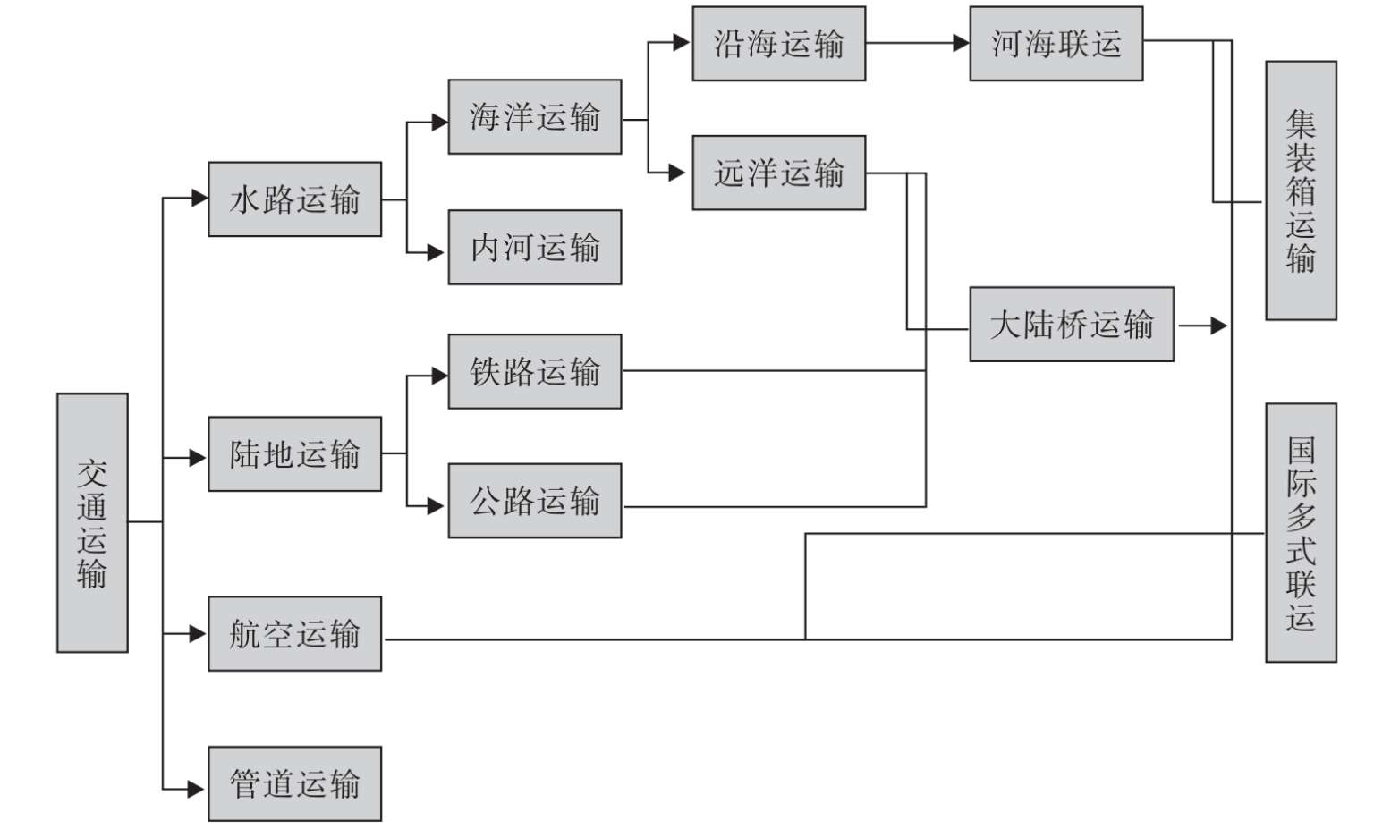 国际贸易运输根据采用的运输工具的不同可分为水路运输、陆地运输、航空运输、管道运输等多种运输方式。其中水路运输又分为海洋运输和内河运输,陆地运输分为铁路运输和公路运输。其他运输方式主要包括邮政运输、集装箱运输、大陆桥运输和国际多式联运等(见图2-1)。