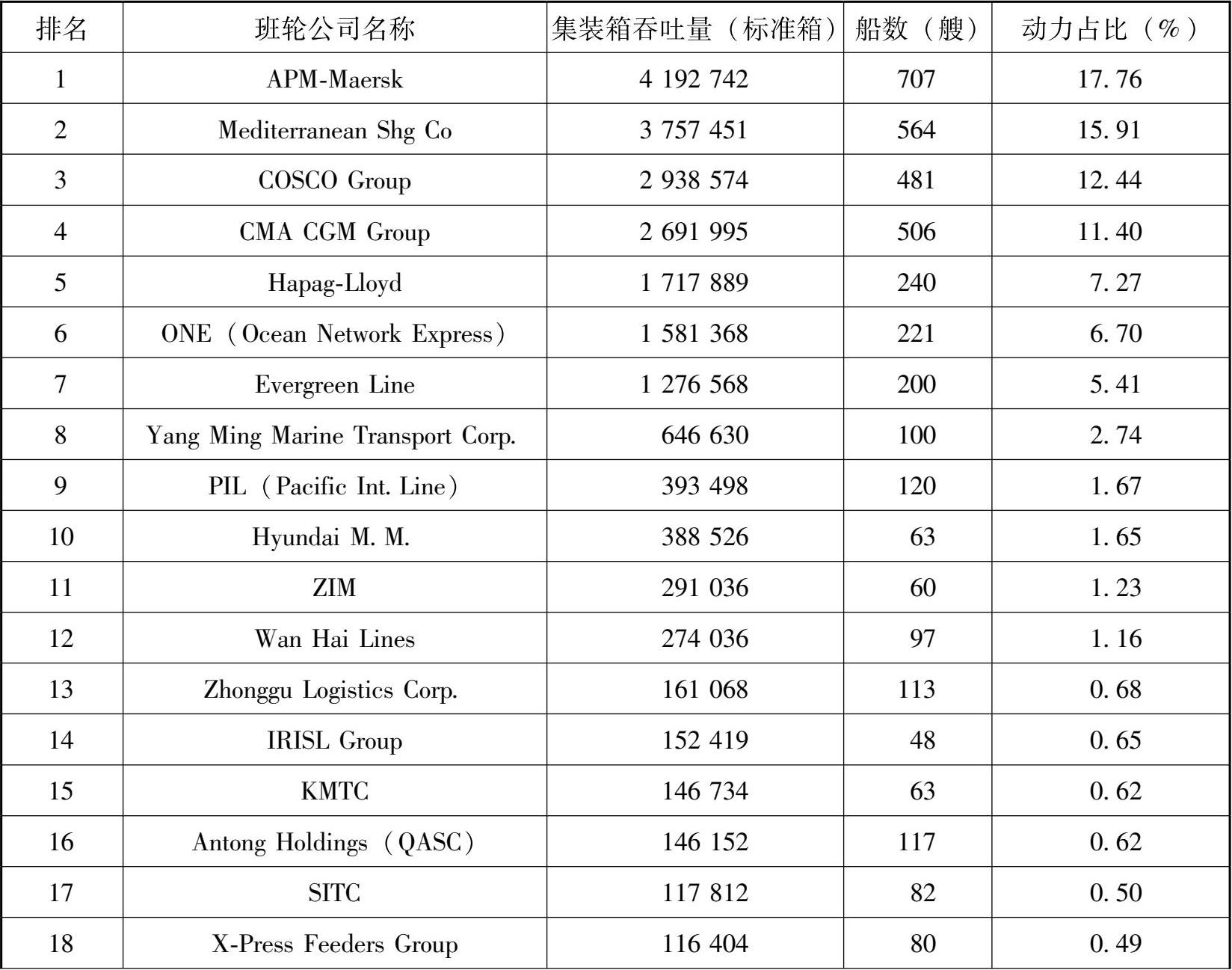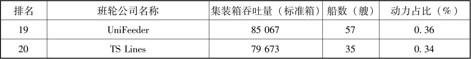 根据Alphaliner公布的数据,排名前二十的集装箱班轮公司运力占全球的89.7%(见表2-1)。