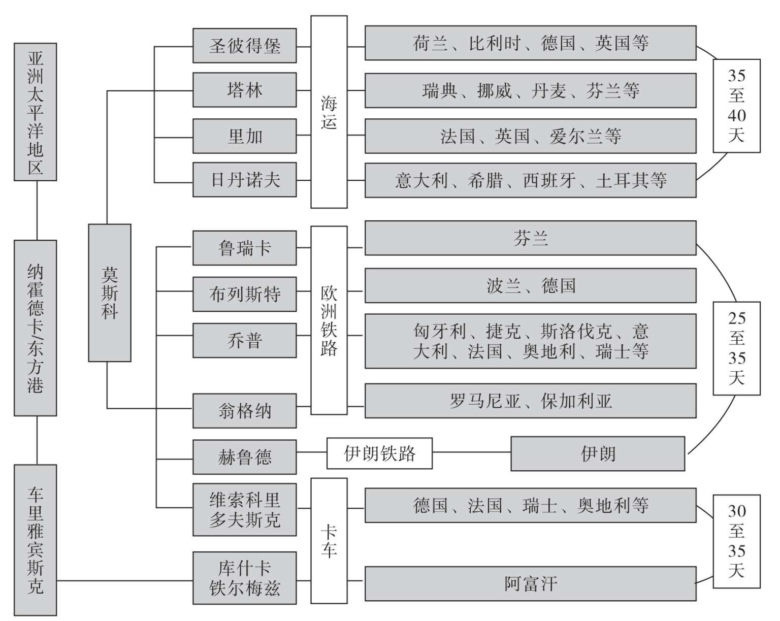 西伯利亚大陆桥是利用俄罗斯西伯利亚铁路作为陆地桥梁,把太平洋远东地区与波罗的海和黑海沿岸以及西欧大西洋口岸连接起来。此条大陆桥运输线东起海参崴的纳霍德卡港口,横贯欧亚大陆,至莫斯科,然后分三路:一是从莫斯科至波罗的海沿岸的圣彼得堡港,转船往西欧、北欧港口;二是从莫斯科至俄罗斯西部国境站,转欧洲其他国家铁路(公路)直运至欧洲各国;三是从莫斯科至黑海沿岸,转船往中东、地中海沿岸(见图2-2)。