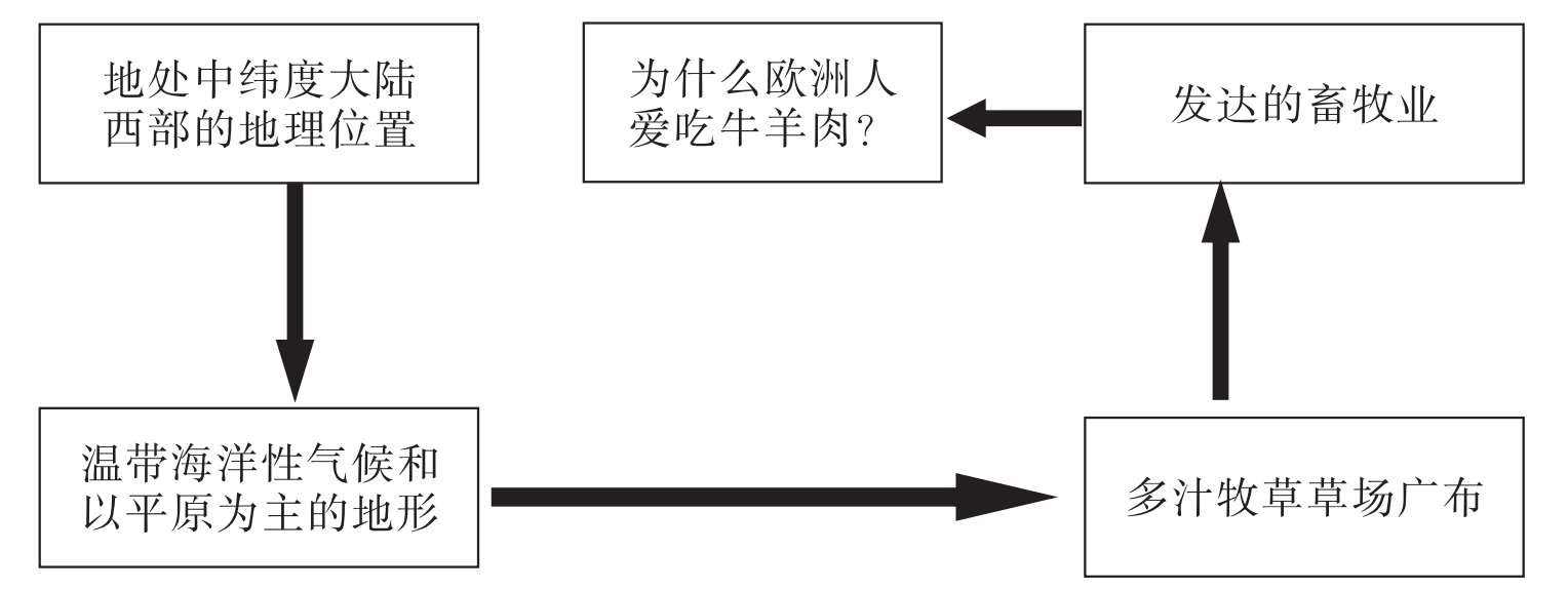 欧洲人酷爱乳制品和牛羊肉,他们的餐桌上常见牛排、奶油、奶酪等食品。欧洲人的这种饮食结构与这里发达的畜牧业有着密切的关系(见图1-1)。