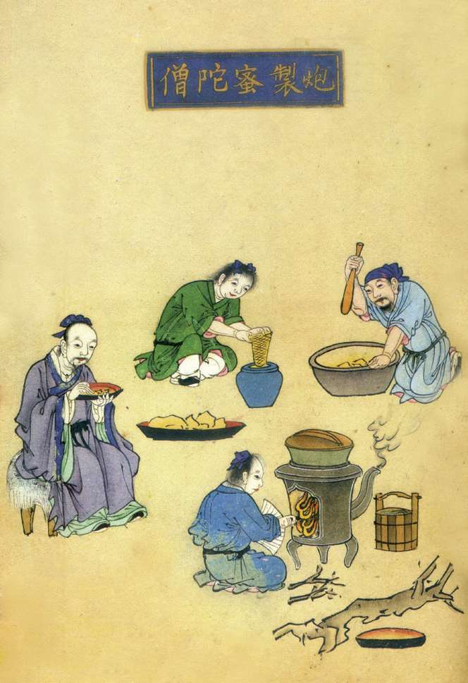 图中四人,按雷公法,右上一人捣杵令细,左上一人将细末入罐,右下一人烧火煮药,左下一人端坐拨弄盘中之药。