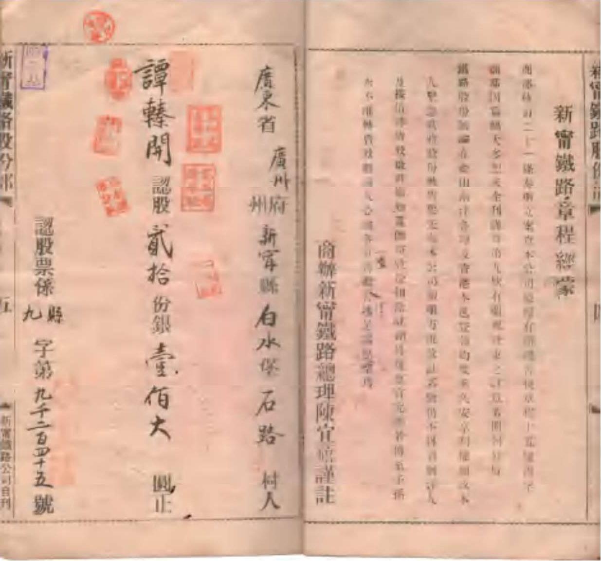 1909年谭犊开的商办广东新宁铁路股份簿