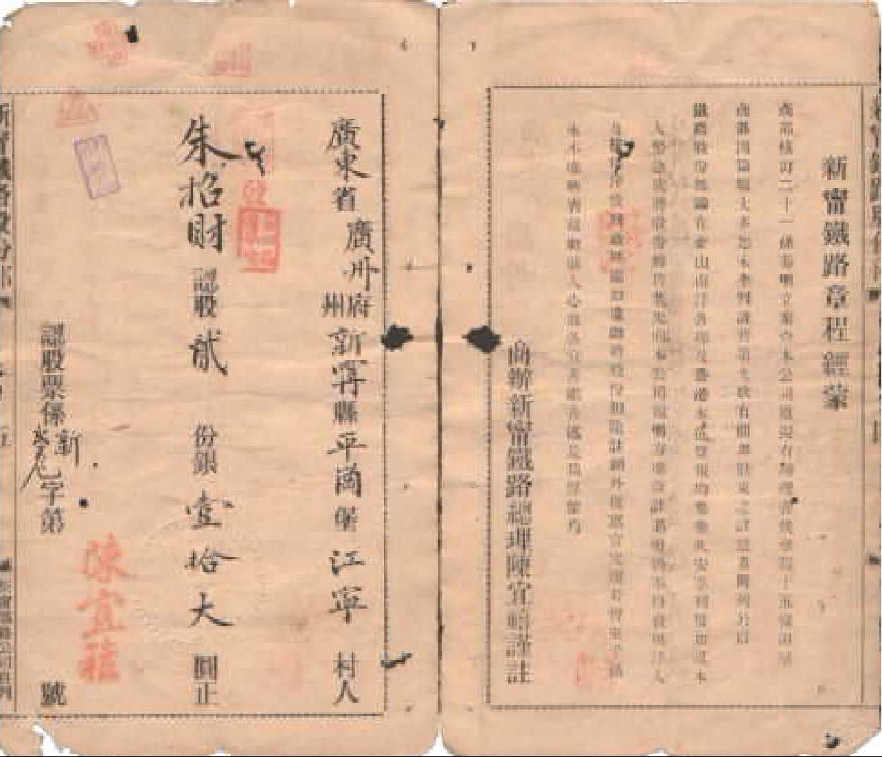 1909年朱招(照)财的商办广东新宁铁路股份簿