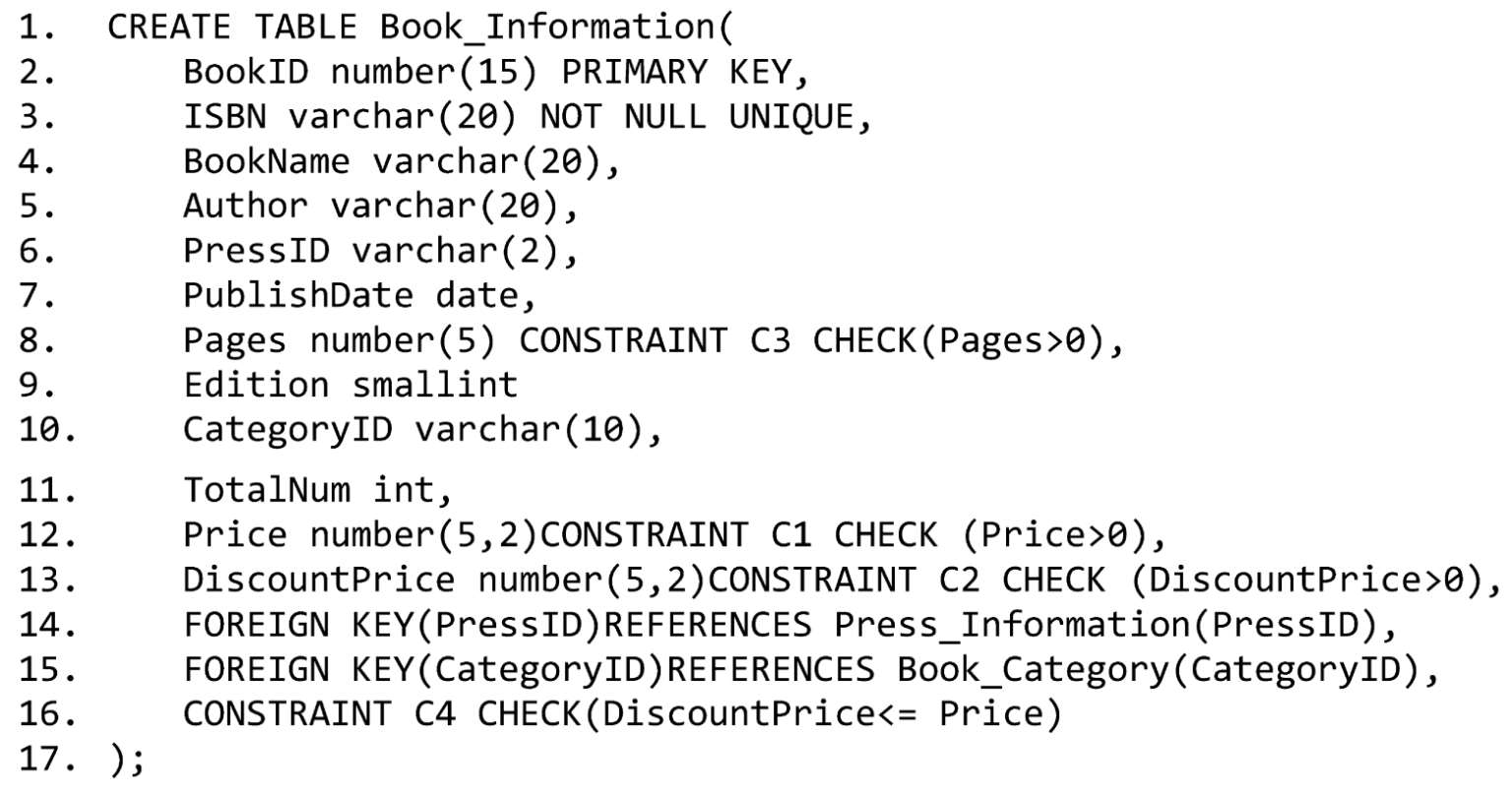 【例2-22】 建立书籍信息表Book_ Information (BookID,ISBN,BookName,Author,PressID,PublishDate,Pages,Edition,CategoryID,TotalNum,Price,DiscountPrice)。