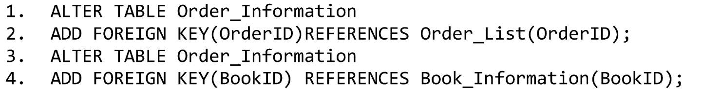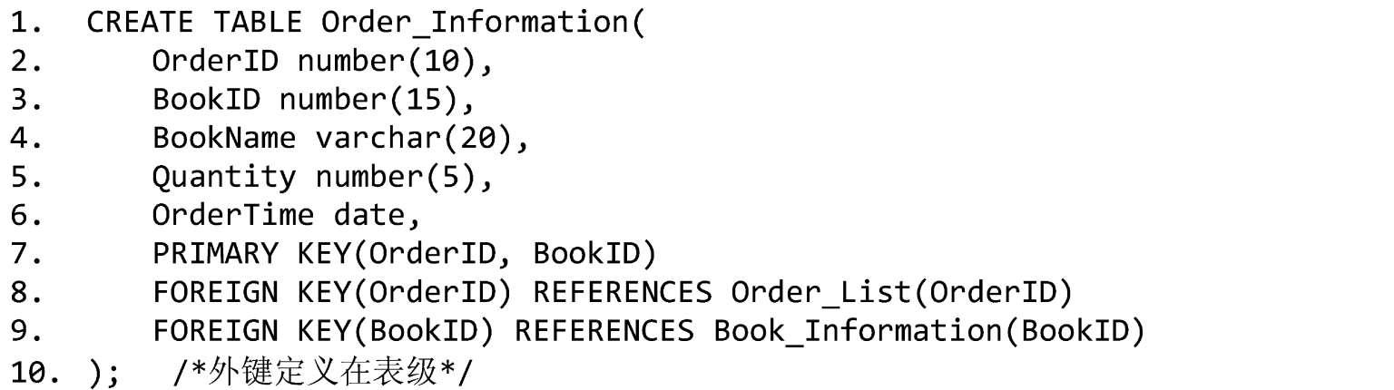 【例2-19】 创建订单信息表(Order_ Information),主键为订单号(OrderID)和书籍编号(BookID),外键为订单号(OrderID)和书籍编号(BookID)。