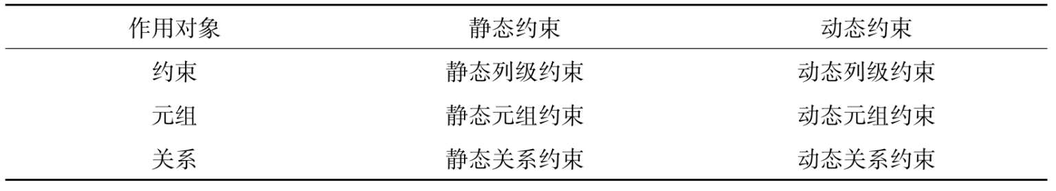 (1)动态列级约束。它包括两类,一是修改列定义时的约束,如当把允许空值的列改为不允许空值时,如果该列目前存在空值,则拒绝修改;二是修改列值时的约束(新旧值之间需要满足某种约束条件),如图书新价格调整不得低于原来价格。
