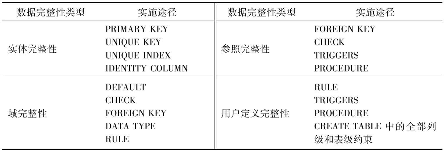 实施数据完整性有两种方式:声明数据完整性和过程数据完整性。声明数据完整性就是通过在对象定义中来实现。而过程完整性是通过在脚本语言中定义来实现的,当执行这些脚本时就可以强制完整性的实现。本节着重介绍声明数据完整性,具体的实施途径请参考表2-14。