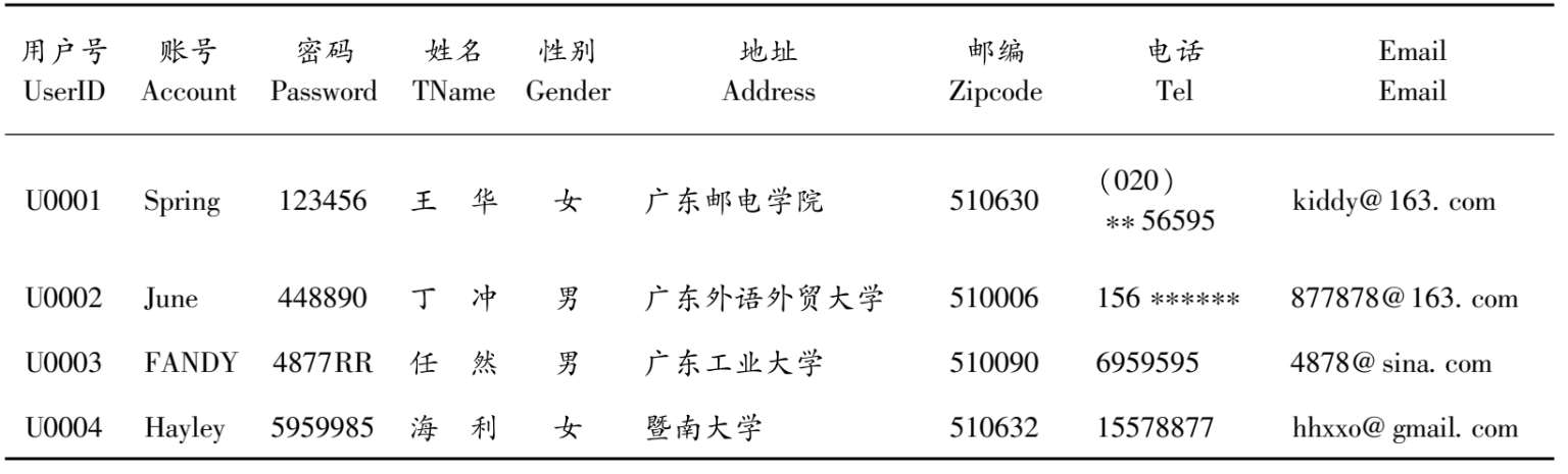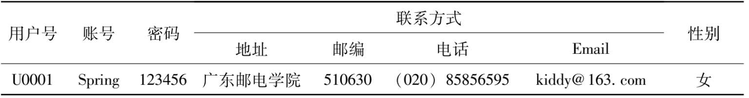 ⑦列不可再分性。二维表中每一个属性值都是不可分的基本数据项,或者说所有属性值都是一个确定的值,而不是值的集合。属性值可以为空值,表示“未知”或“不可使用”,但不可“表中有表”。满足此条件的关系称为规范化关系,否则称为非规范化关系。如表2-8所示,若以“用户表(用户号,账号,密码,联系方式,性别)”作为该二维表的关系模式,则出现了还可细分的数据项“联系方式——地址、邮编、电话、Email”,不满足列不可再分性的,不是规范的“关系”。