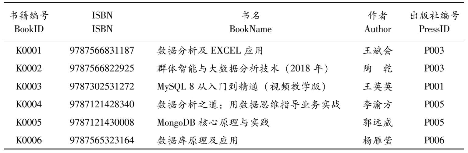 ②书籍(书籍编号,ISBN,书名,作者,出版社编号,出版日期,页数,版本,分类编号,库存数量,价格,折扣价),关系表如表2-2所示。