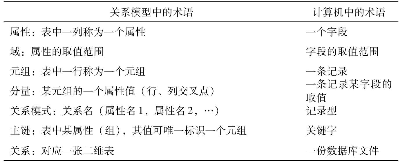表2-7 关系模型中的主要术语(与计算机中的术语对照)
