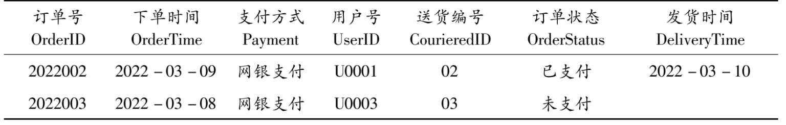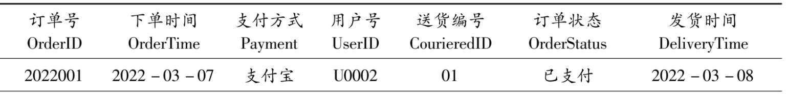 ④订单信息(订单号,书籍编号,书名,下单时间,下单数量),关系表如表2-4所示。
