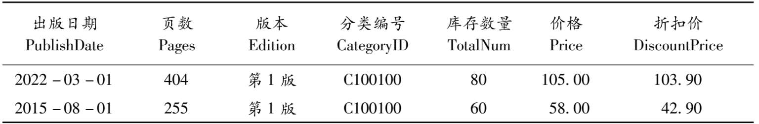 ①属性(Attribute):表中的一列代表了一个属性,而每个属性都有一个属性名。如表2-2中,书籍编号、ISBN、作者、出版社编号……都是该书籍信息表的属性。
