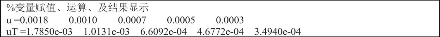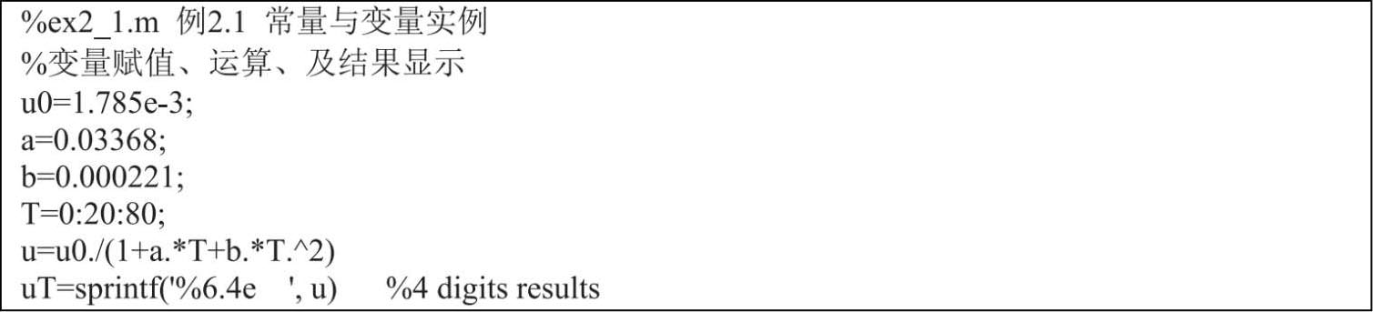 在Matlab命令行窗口运行ex2_1.m的这些语句,得到如下结果。 u 为Matlab命令行窗口默认短型数值显示, uT 为格式化的保留至小数点后 4 位数字的科学计数法数值显示,这些定义的变量中除 uT 为字符串变量外,其他都是数字变量。