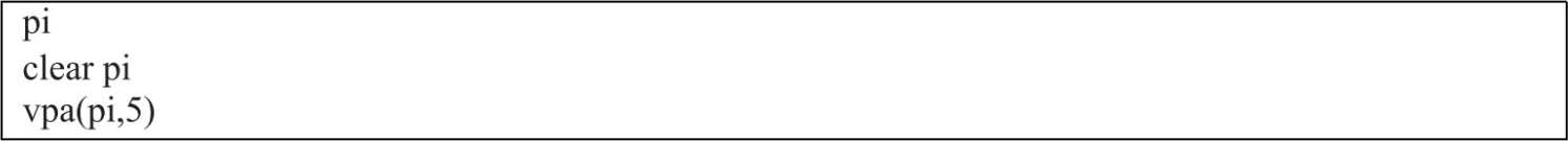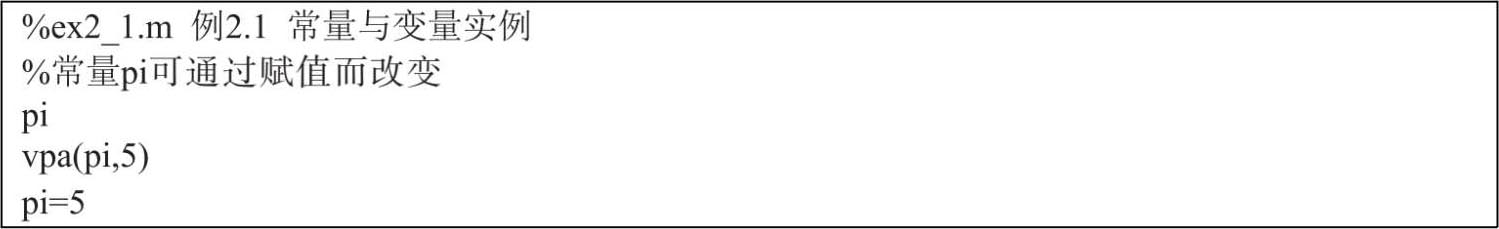 在Matlab命令行窗口运行ex2_1.m的这些语句,得到如下结果。可以看出,圆周率 pi 在Matlab中是常量 355 /113,缺省时其显示为 3.1416;若赋值变量 pi 为 5,则常量 pi 被替换为5;清除变量 pi 后,Matlab中的常量 pi 为 3.1416 不变。