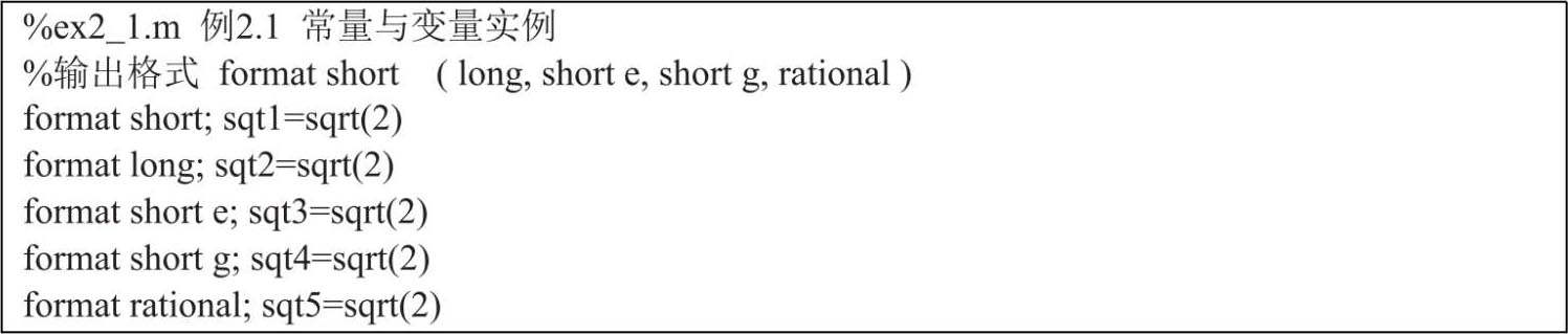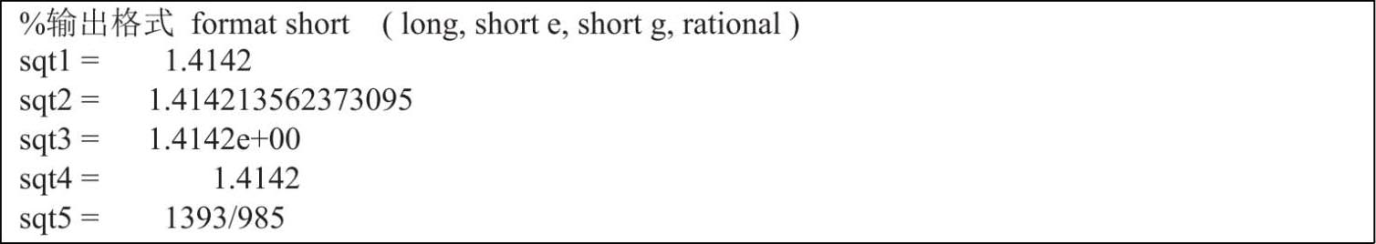 在Matlab命令行窗口运行ex2_1.m的这些语句,得到如下结果。可以看出,设定不同输出格式时,如短型(format short)、长型(format long)、短型科学计数(format short e)、短型十进制(format short g)以及分数形式(format rational),数值 2 的开方值显示不同的结果。