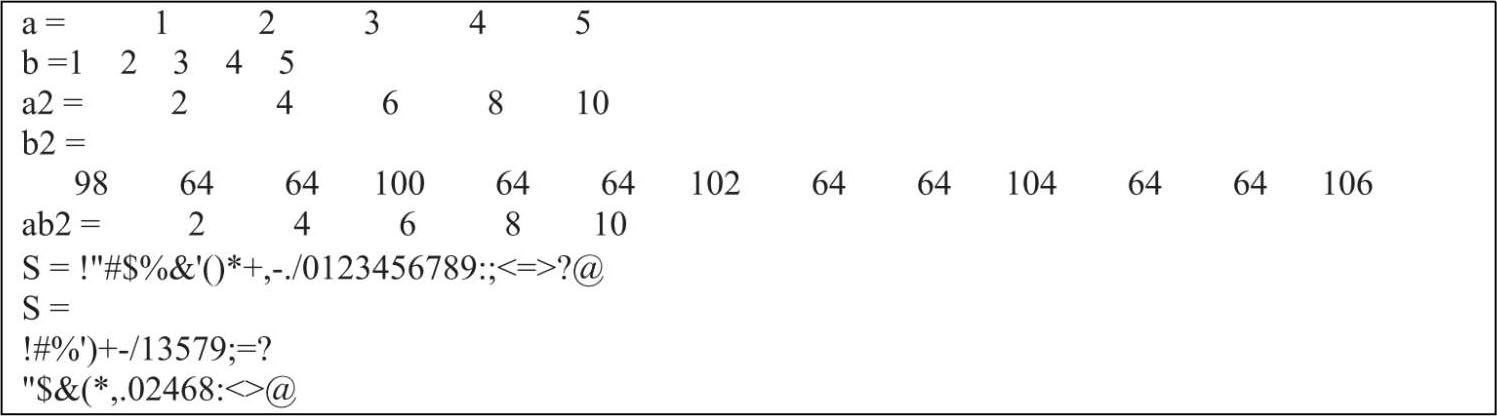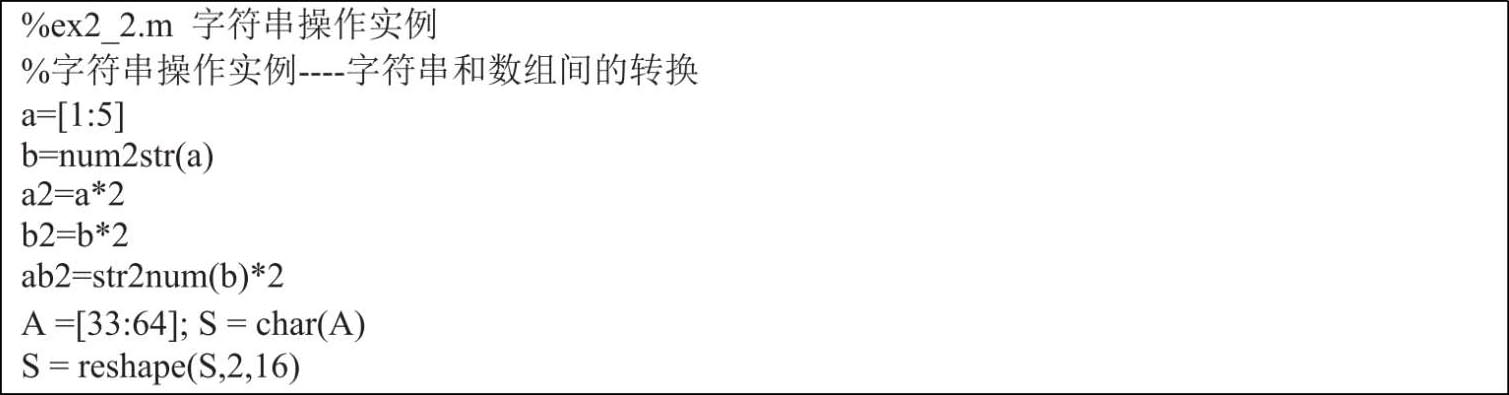 在Matlab命令行窗口运行ex2_2.m的这些语句,得到如下字符串和数组间转换的结果: a 是数字变量, b 是字符串变量; a 2 是数字变量的运算结果, b 2 是字符串存储的相应数字的运算结果, ab 2 是先将 b 由字符串变量转换为数字变量后再运算的结果; S 为数字矩阵 A 的元素定义为字符串的显示,进而将 S 变形为 2 行 16 列的字符串数组。