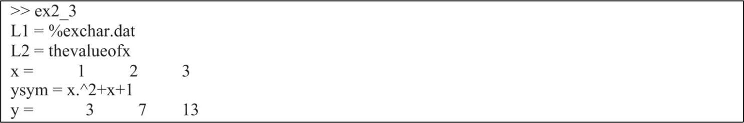 在Matlab命令行窗口运行程序ex2_3.m,根据文件“ex2_3.dat”输入的数据和定义的运算表达式 y = x 2 + x +1,计算得到变量 y 的值,结果如下。