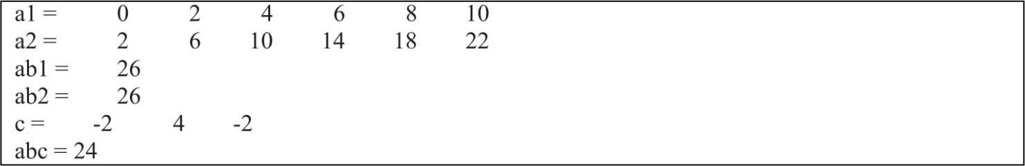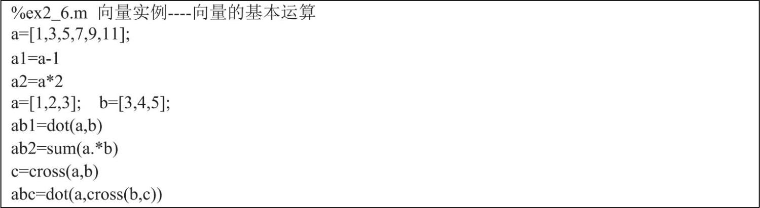 在Matlab命令行窗口运行ex2_6.m中的这些语句,得到向量基本运算的结果如下。