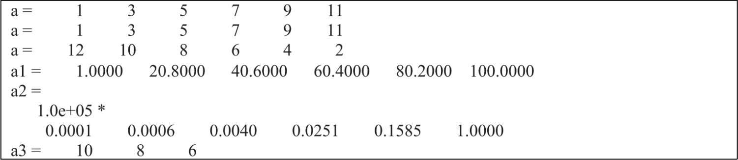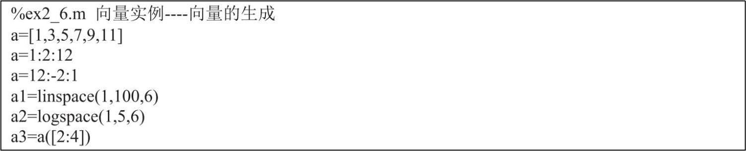 在Matlab命令行窗口运行ex2_6.m中的这些语句,以不同方式生成向量结果如下。