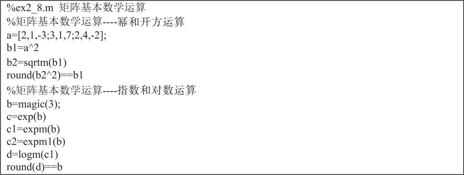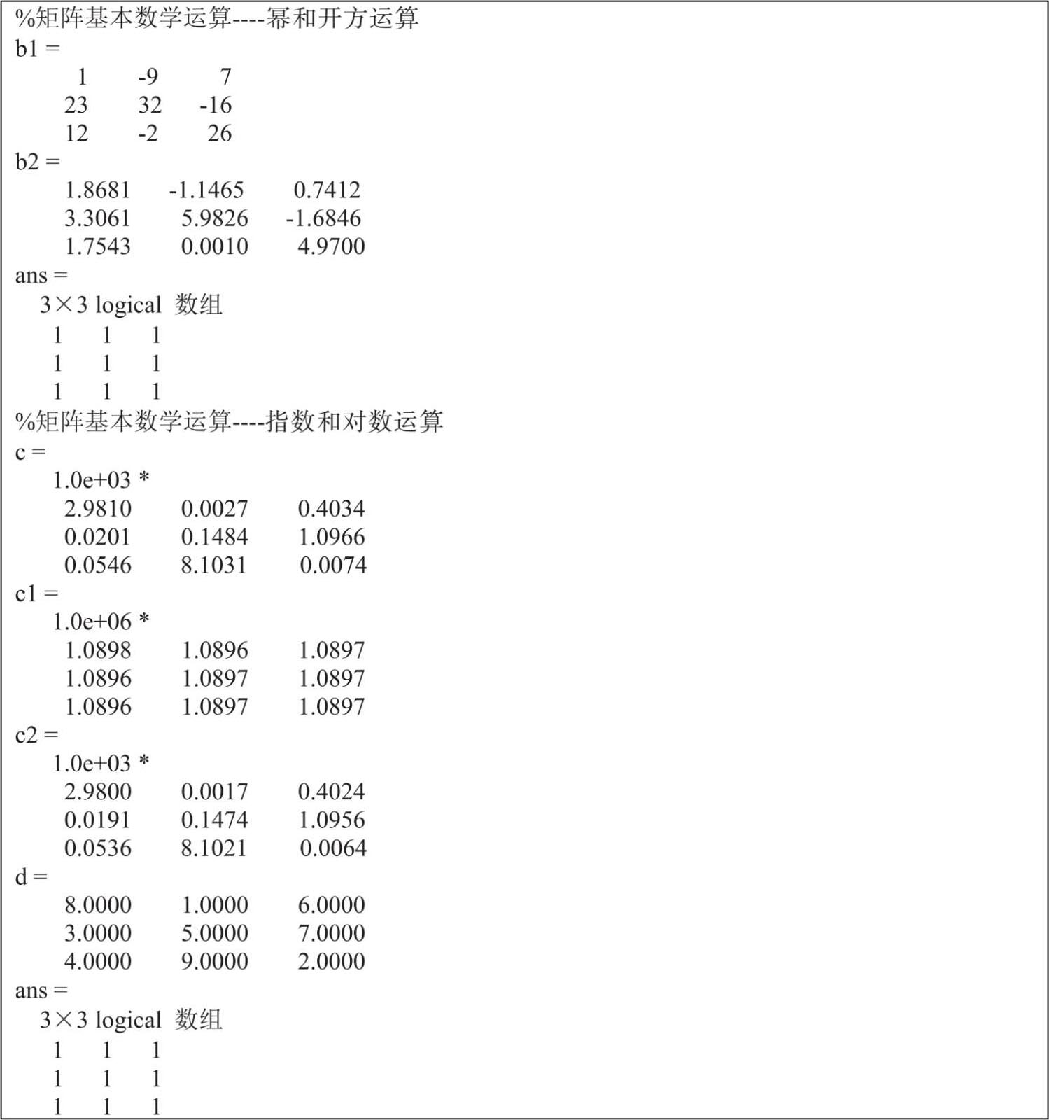 (3)矩阵基本数学运算——幂和开方运算、指数和对数运算。