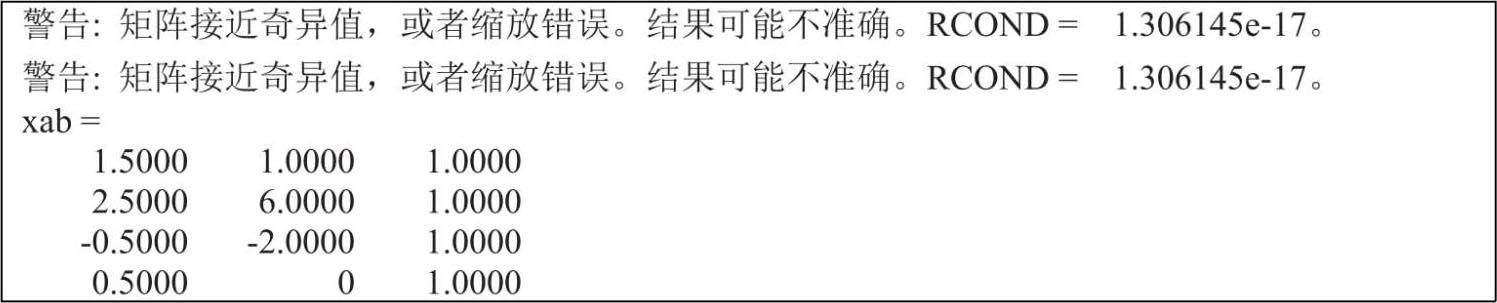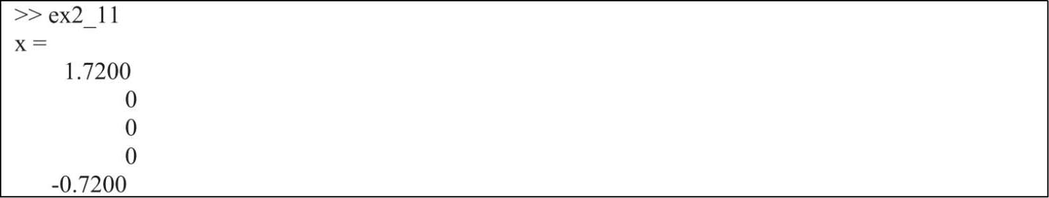 在Matlab命令行窗口运行程序ex2_11.m,得到如下结果。可以看出,该欠定线性方程组的解有 3 个不确定量,以 0 值给出。