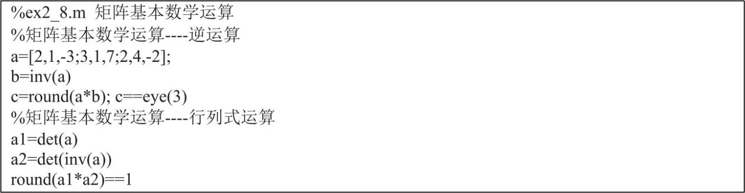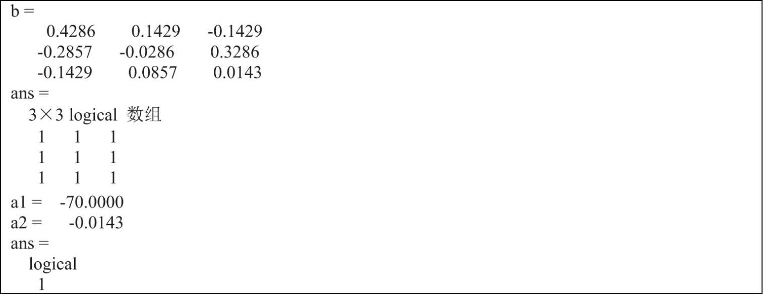 在Matlab命令行窗口运行ex2_8.m中的这些语句,得到如下结果。可以看出:矩阵 a 与它的逆 b 的乘积是单位矩阵,矩阵 a 的行列式 a 1 与矩阵 a 的逆的行列式 a 2 乘积为 1。这些判断通过逻辑数组的元素值为真(值为 1)得到。