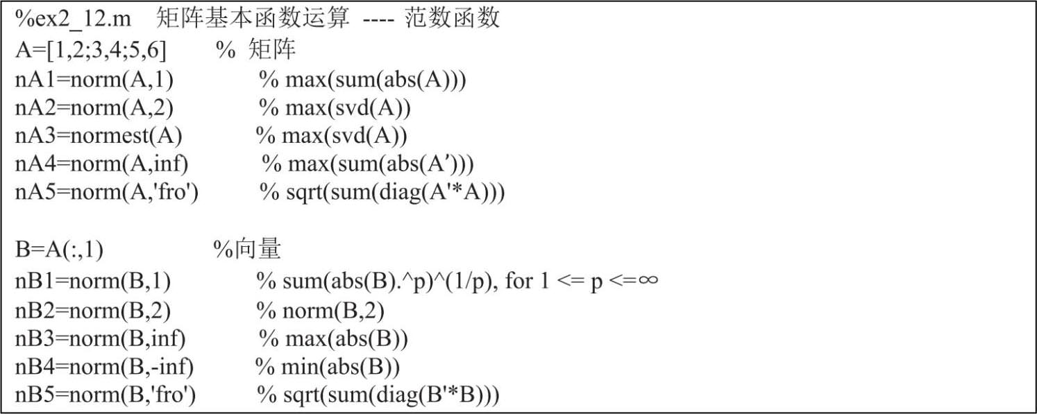 本节介绍的矩阵基本函数运算包括:特征值和奇异值函数、条件数函数、伪逆函数、范数函数、矩阵的秩与迹函数、矩阵的空间函数以及矩阵的通用函数形式。