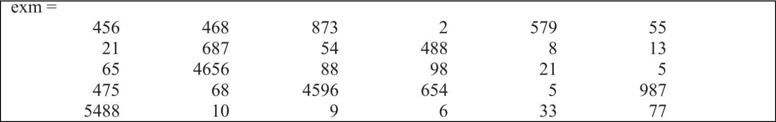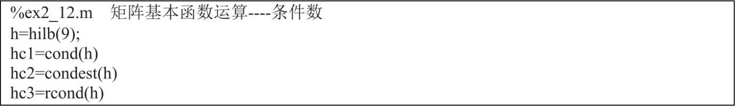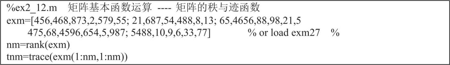 在Matlab命令行窗口运行ex2_12.m中的这些语句,得到矩阵exm的秩和迹结果如下。