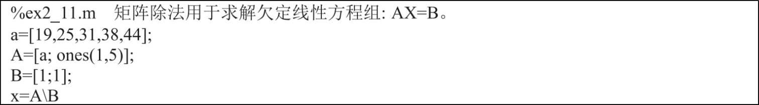 用矩阵除法求解欠定线性方程组与求解恰定线性方程组的方法一样,该程序ex2_11.m如下。