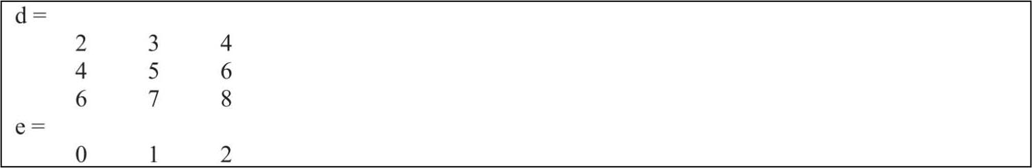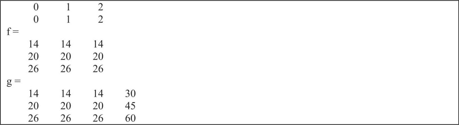 在Matlab命令行窗口运行ex2_8.m中的这些语句,得到如下结果,其中:矩阵 d e f 与矩阵 a b 同维,矩阵 g 与矩阵 c 同维。