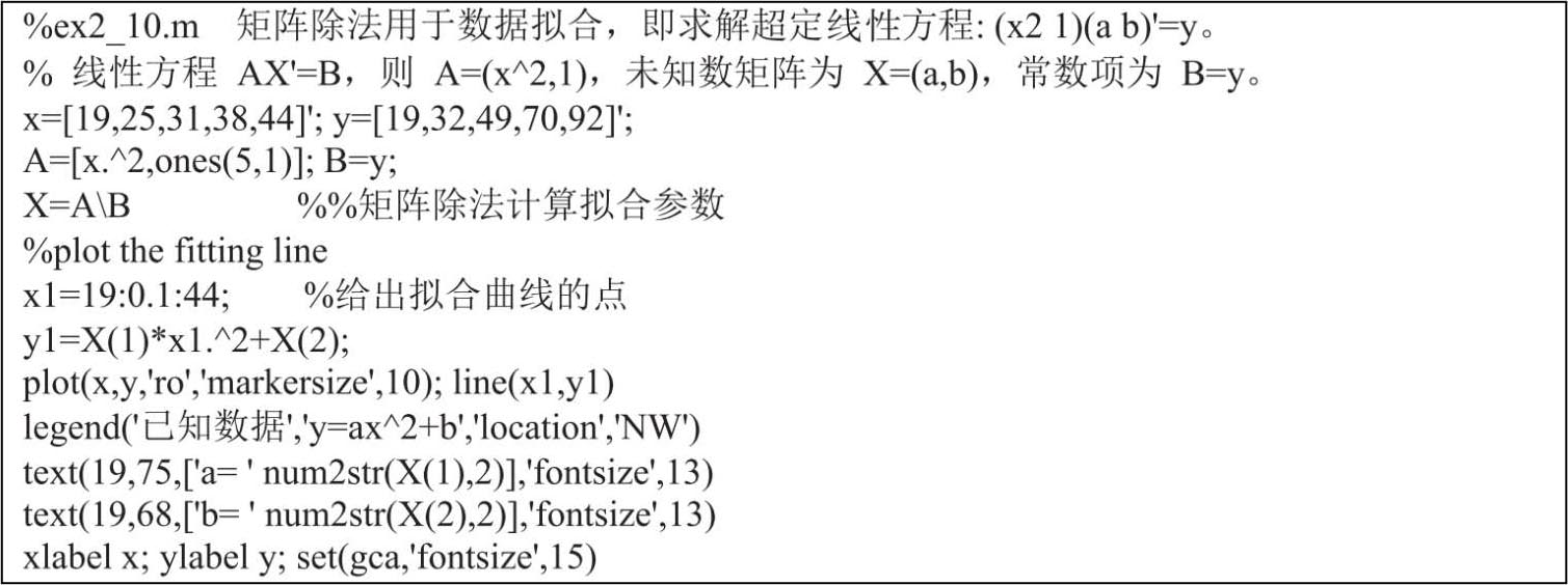 该例题表 2-1 中的 x y 满足 y = ax 2 + b ,由此可列出 5 个方程构成的线性方程组,其求解采用矩阵除法,得到用于数据拟合的参数 a b ,程序ex2_10.m如下。