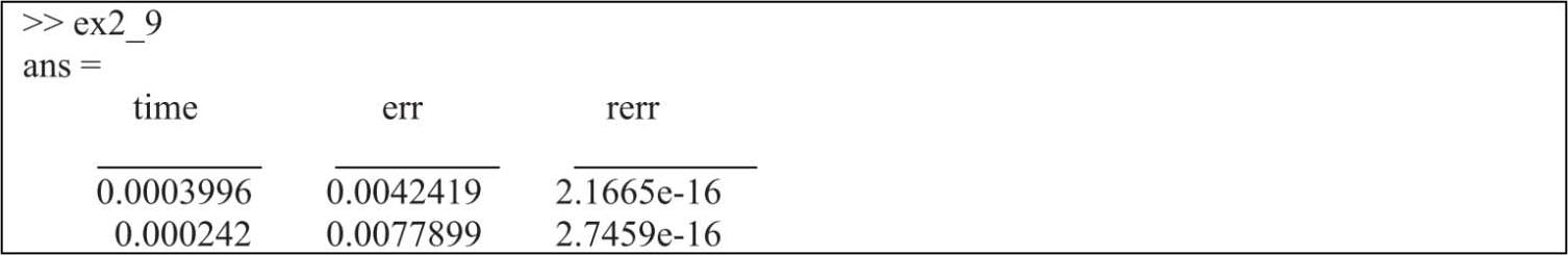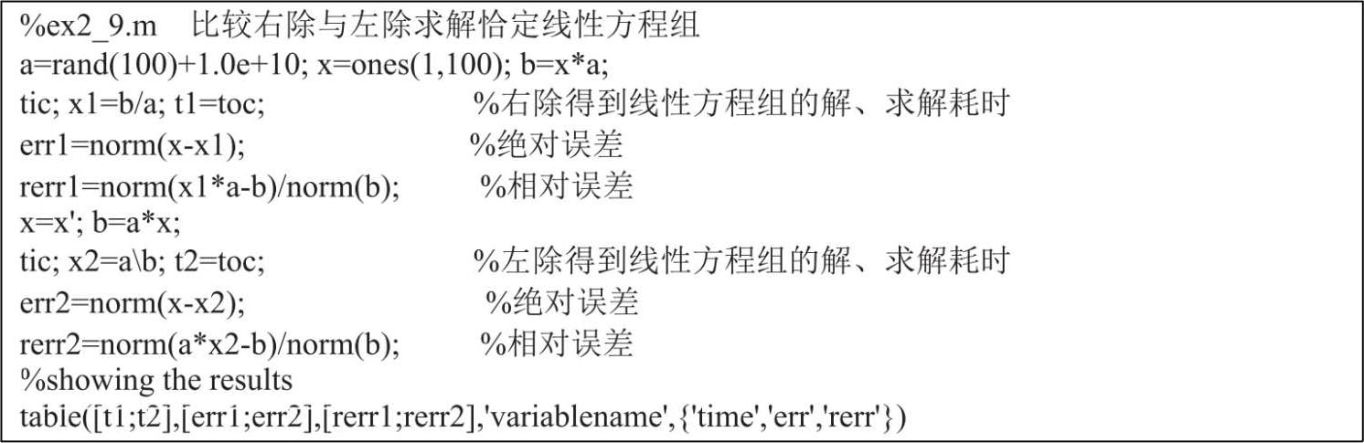 在Matlab命令行窗口运行ex2_9.m,得到如下结果。可以看出:左除耗时 t 2 较少,右除和左除得到的线性方程组解的绝对误差 err 、相对误差 rerr 在同一量级。