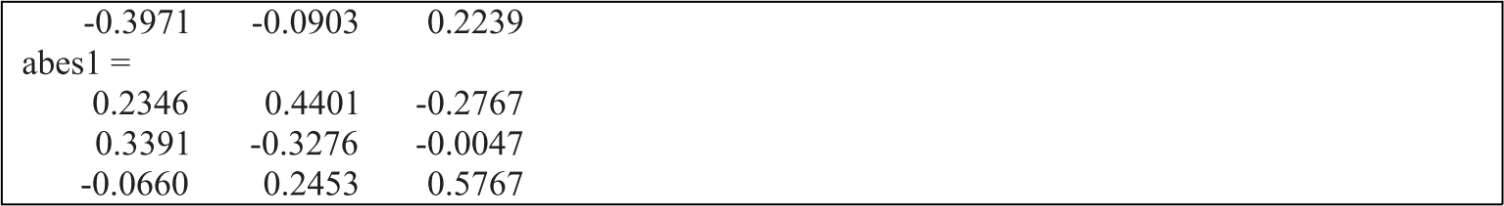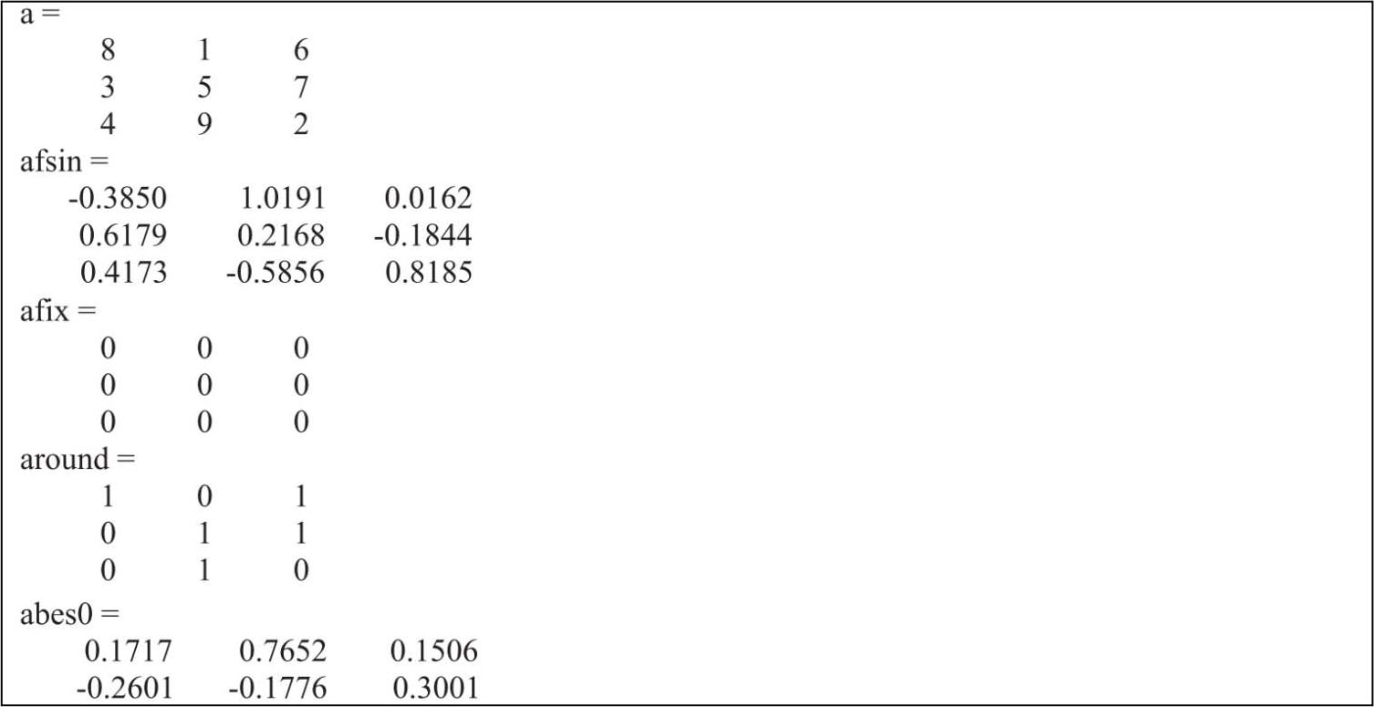 在Matlab命令行窗口运行ex2_12.m中的这些语句,得到如下结果,afsin是 3 阶魔方阵 a 的正弦函数矩阵,afix是矩阵 a /10 各元素取整的矩阵,around是矩阵 a /10 各元素四舍五入的矩阵,abes0 和abes1 分别是矩阵 a 的 0 阶和 1 阶球谐贝塞尔函数值。 bh7k7v8M9taddFW2IAYZmo1sGdFgHobgRBD6pUcRAPJQlHbPaz5LF3AgiS8ShTam